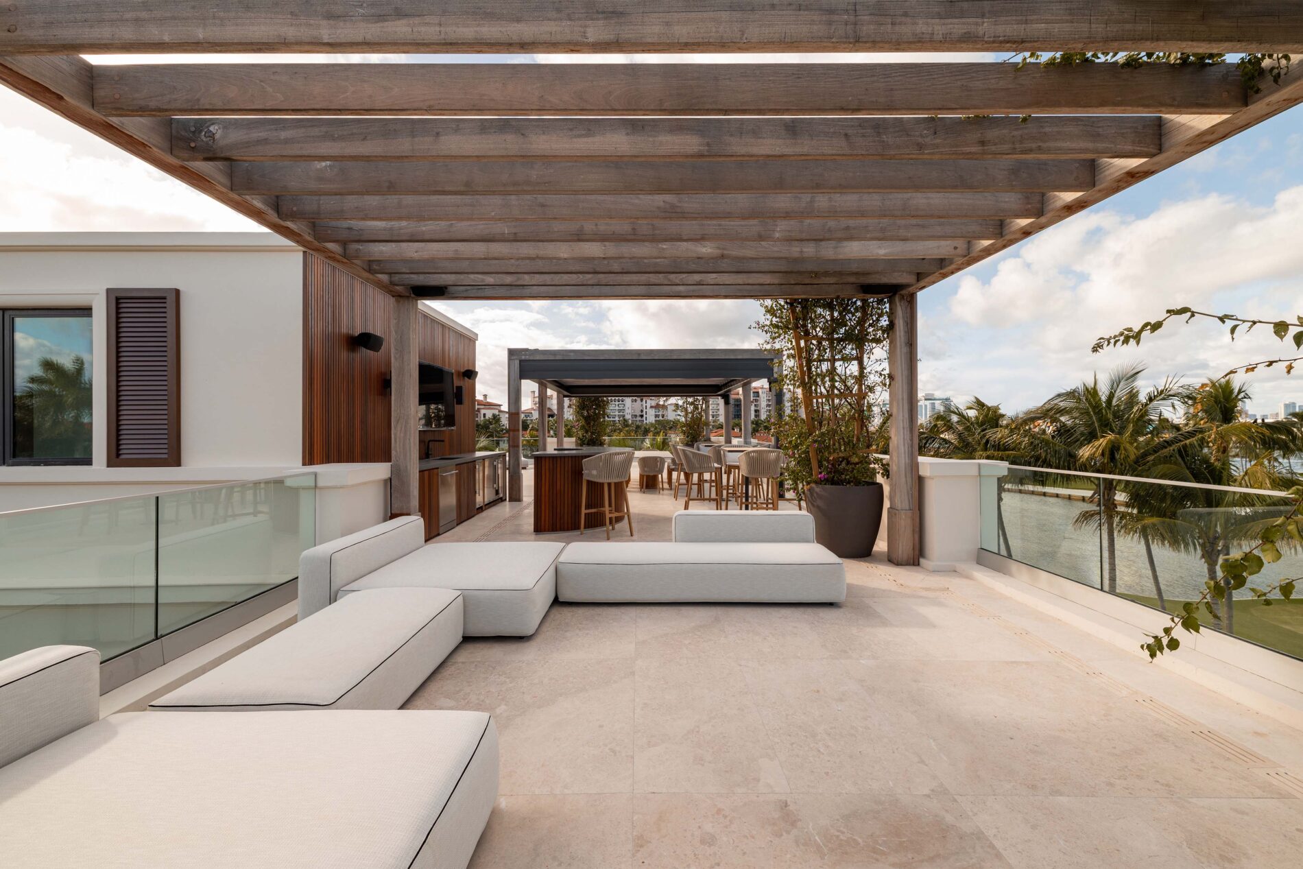 Villa 6 extends outdoors, where each exterior feature has been crafted to inspire relaxation and connection to Fisher Island's beauty. Enzo Enea’s signature landscape design frames the property with lush greenery and meticulously maintained outdoor spaces. The zero-edge heated gunite pool and spa offer a tranquil escape, with a private rooftop terrace that boasts a summer kitchen for al fresco dining and entertaining.