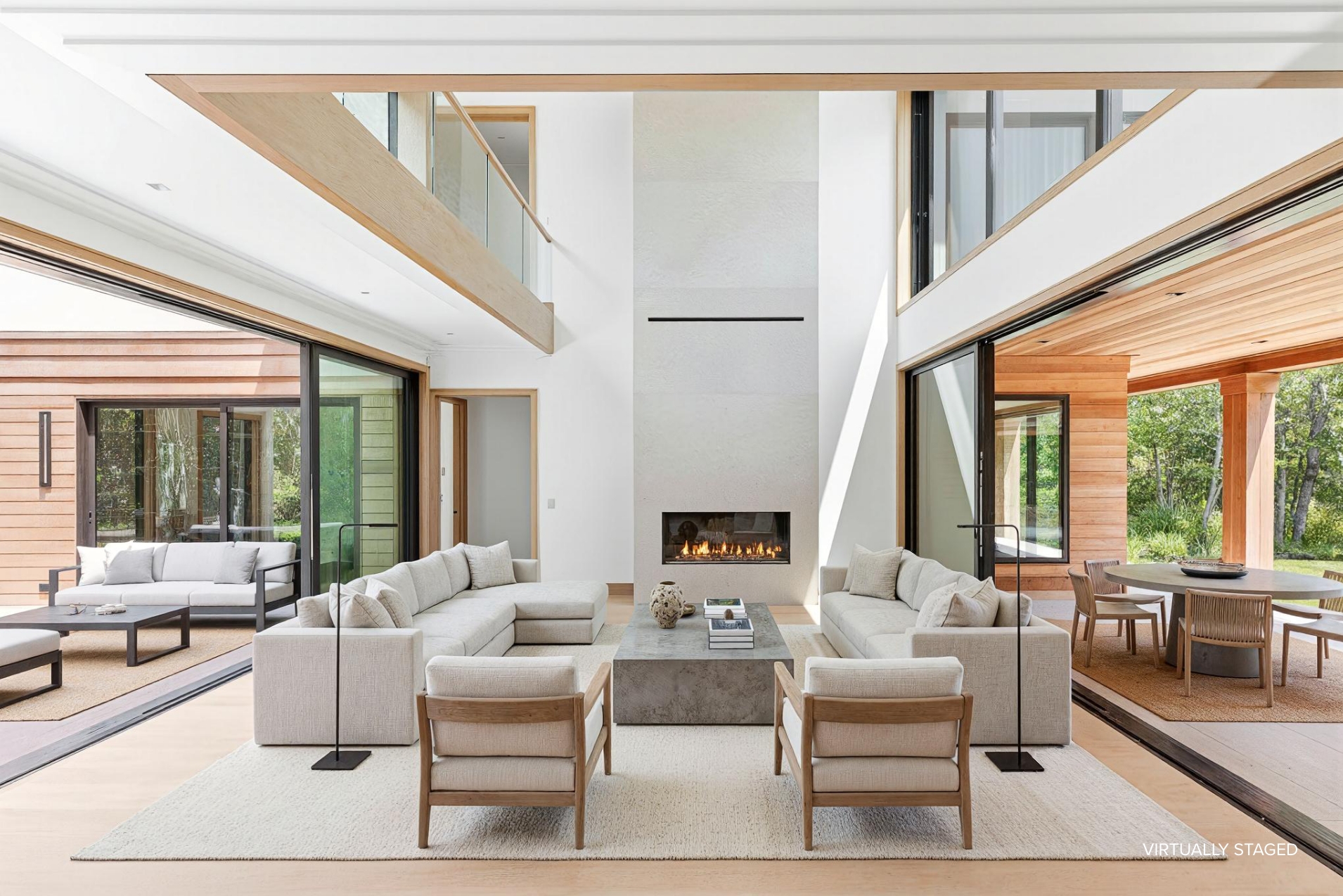 Retractable glass doors connect the dining area to two covered porches, while the adjacent double-height great room features a stone-clad gas fireplace and floor-to-ceiling windows.