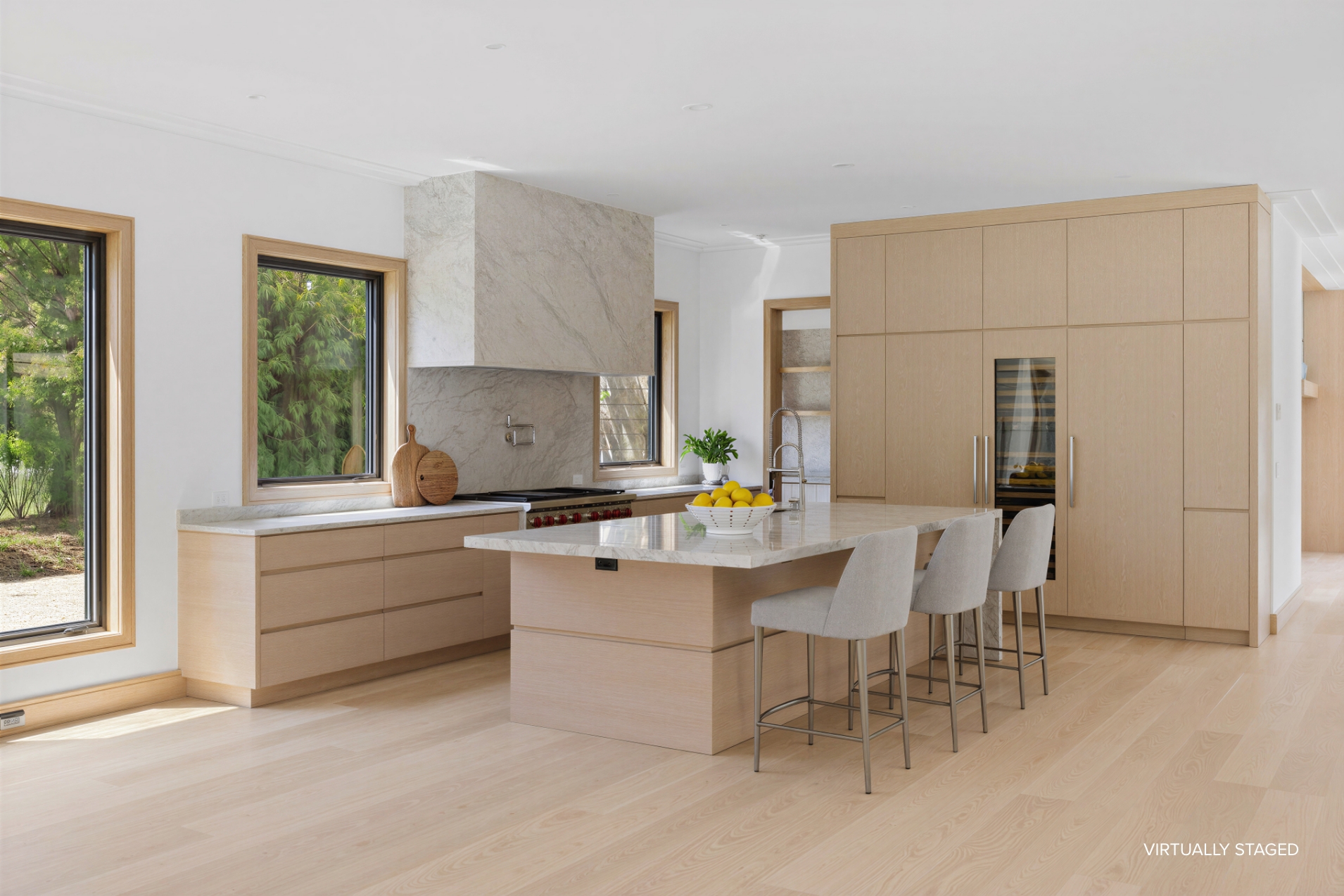 The open-concept chef’s kitchen includes marble countertops, a center island with bar seating, Sub-Zero refrigerator, freezer, and wine fridge, Bosch dishwashers, Wolf range, and a full butler’s pantry.