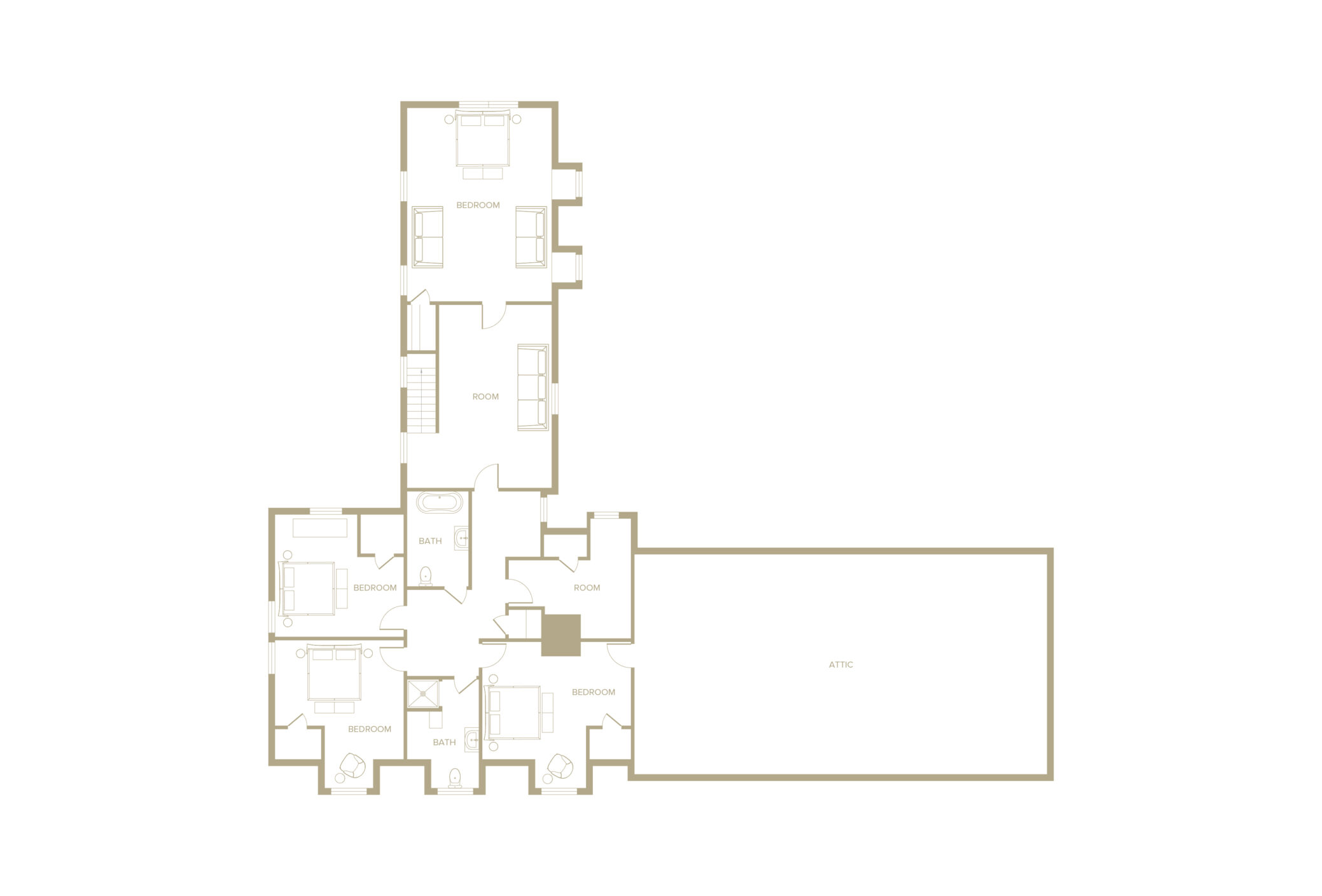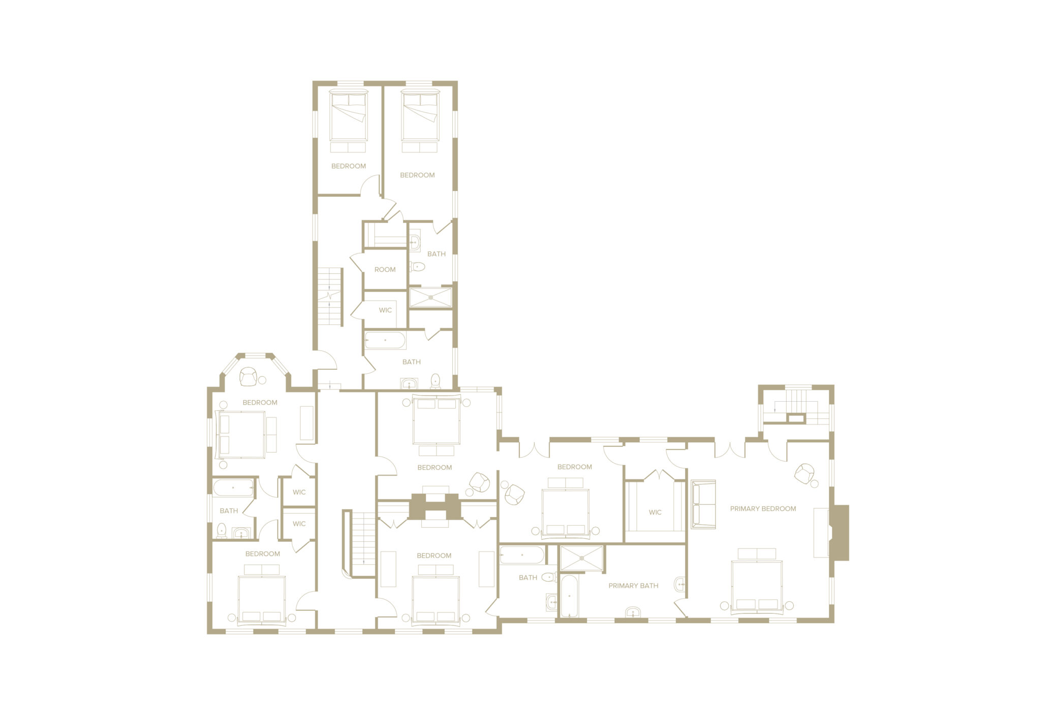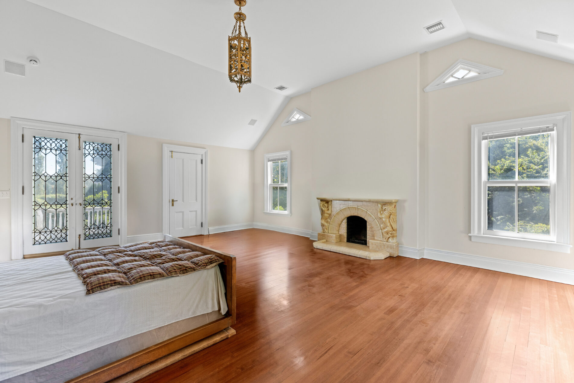 The 2,915 SF+/- second level is centered on the primary suite, a vaulted retreat with a wood-burning fireplace, a walk-in closet, and an en-suite bathroom. The level also offers 2 en-suite bedrooms, 1 with a fireplace, as well as 5 guest bedrooms served by 2 full bathrooms.
