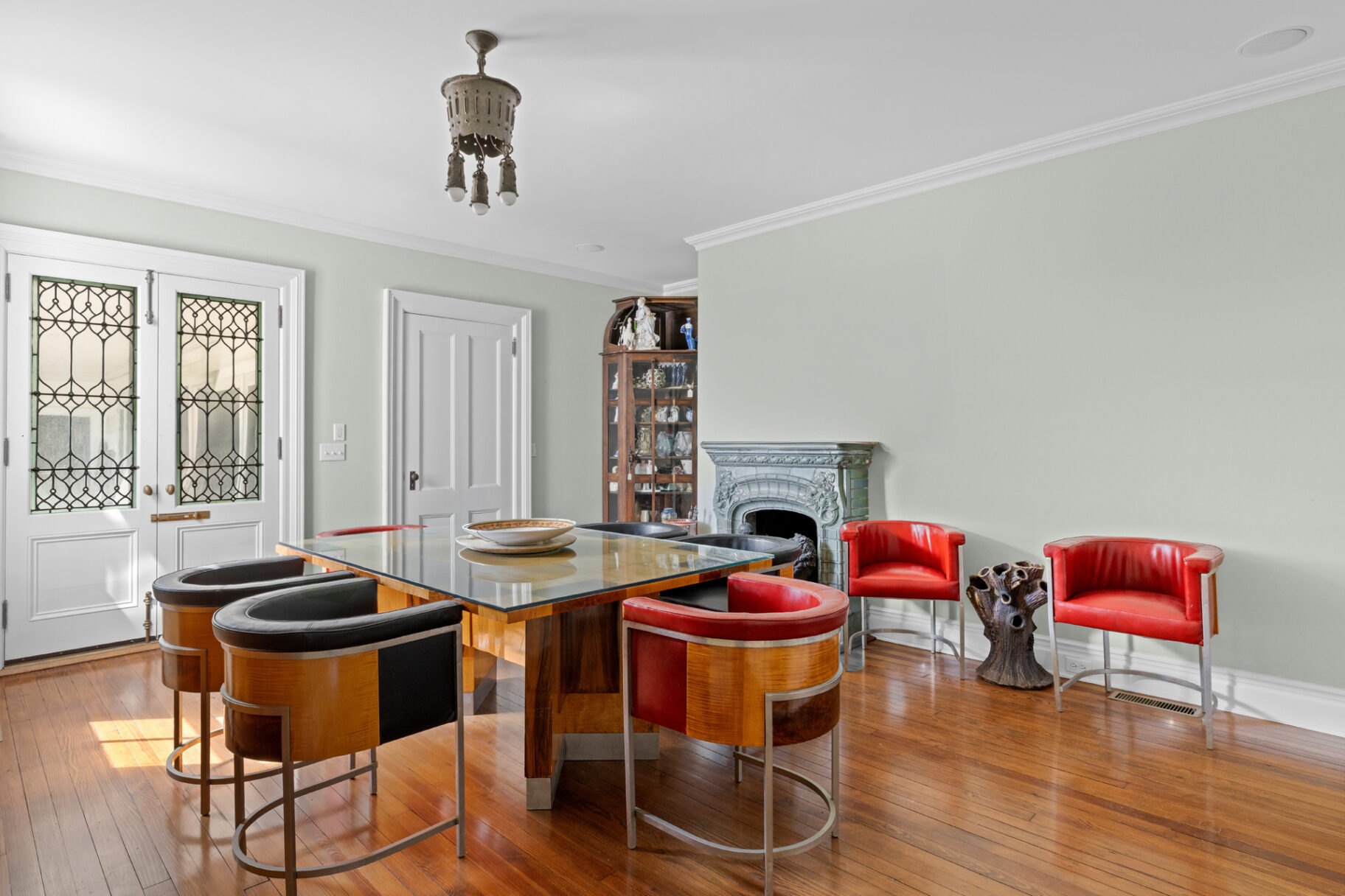 The dining area accommodates 6+ guests with French doors. An eat-in kitchen with a breakfast area combines high-end appliances, custom cabinetry, and pendant lighting. An office, pantry, laundry, linen closet, and 2 powder baths complete this level.