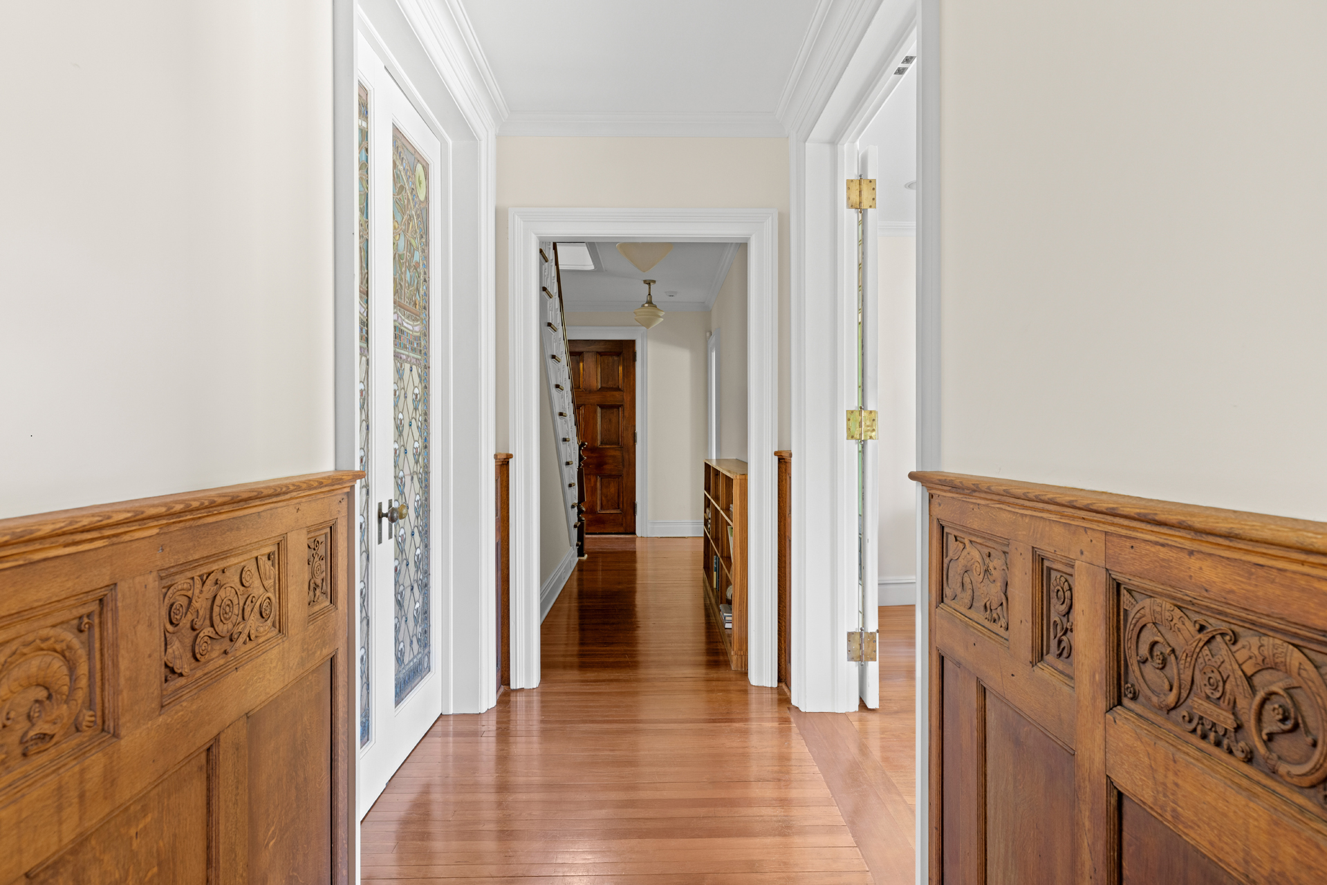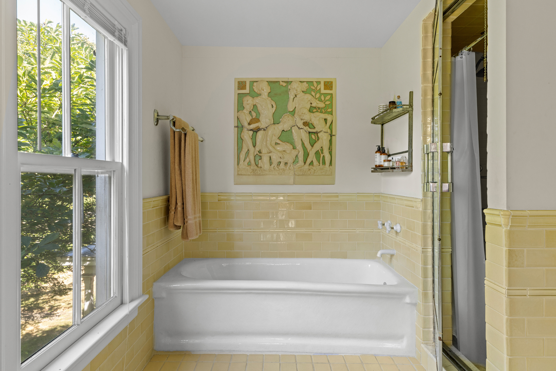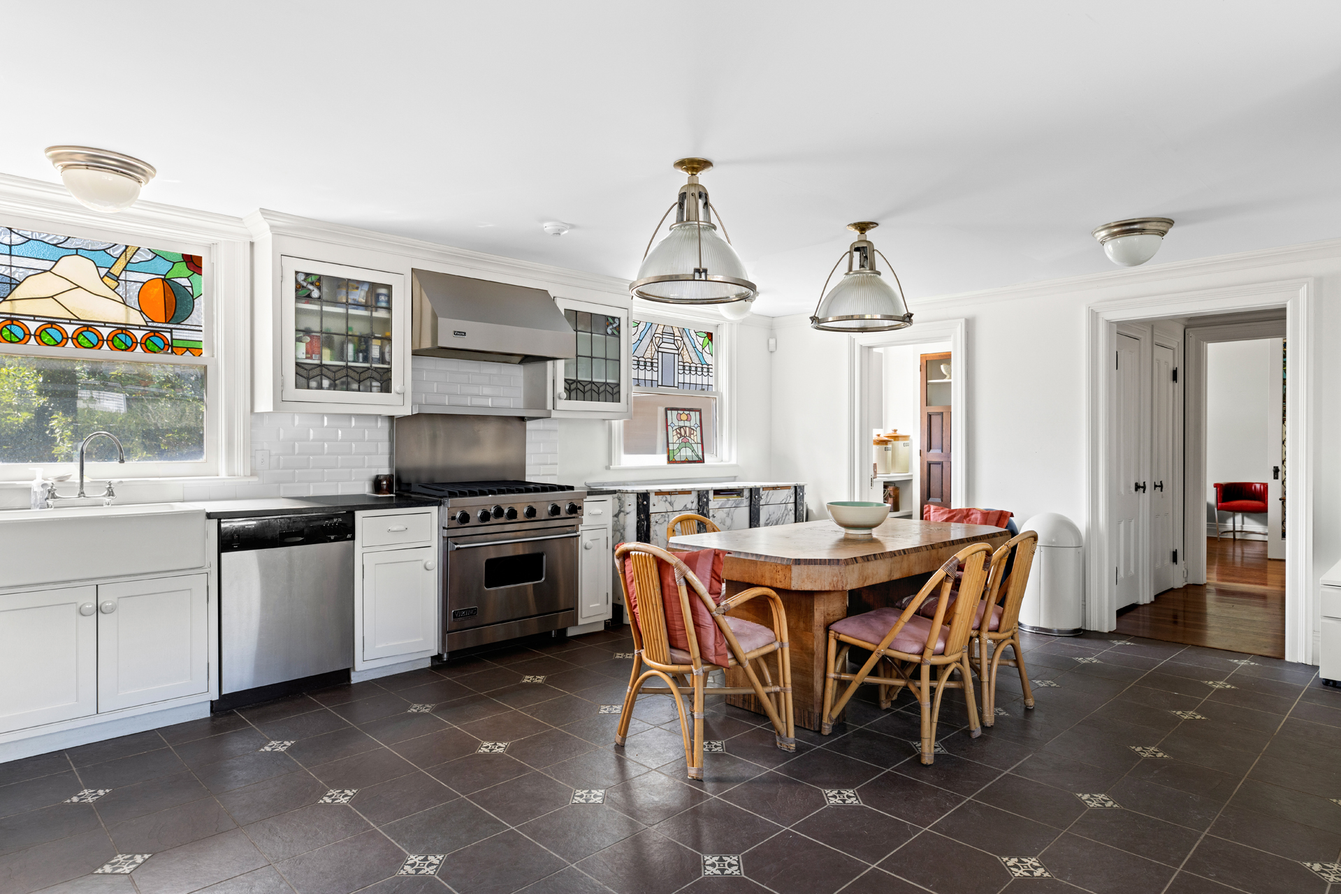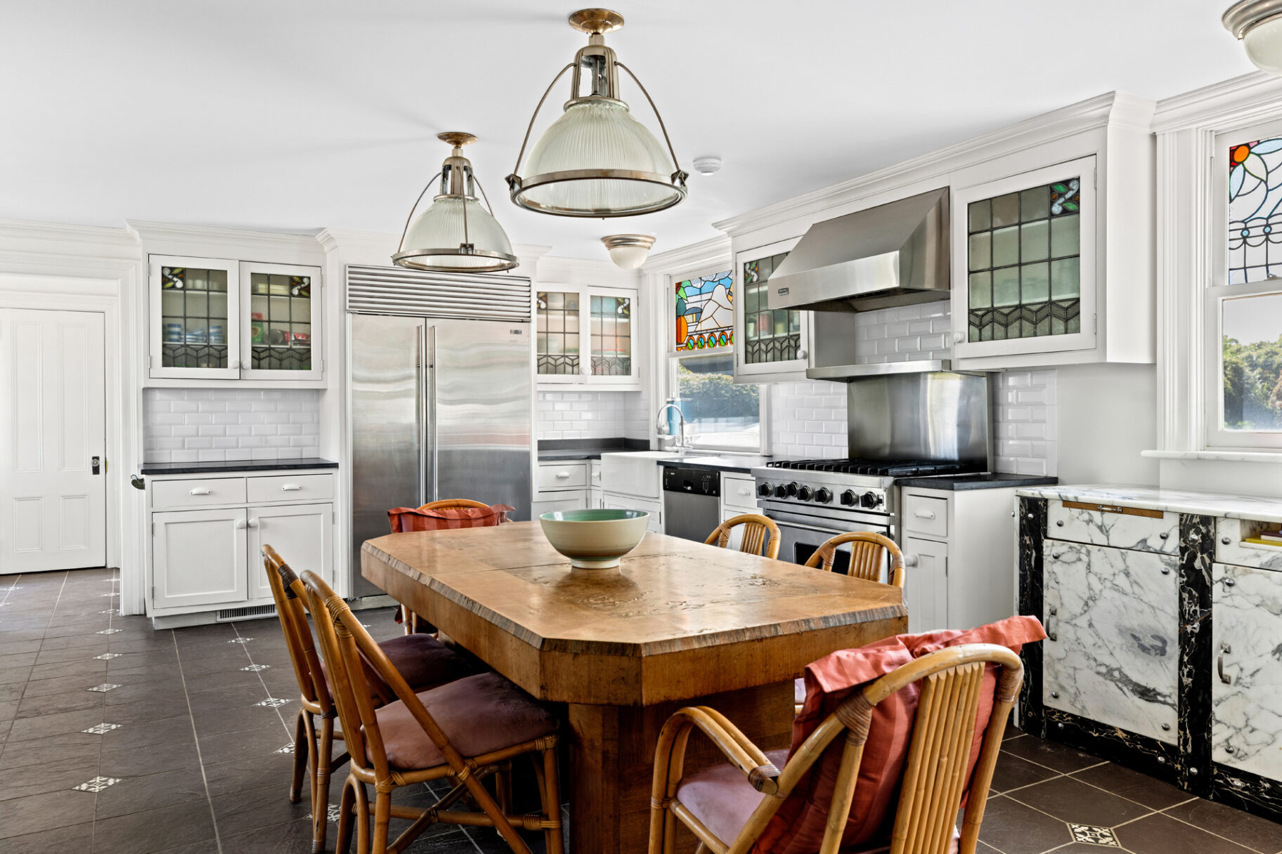 The 3,151 SF+/- first level opens with a sunlit foyer of mosaic tile windows and hardwood floors. The living and dining rooms, each with a fireplace, flow seamlessly to a family room, sitting room, and terraces beyond.