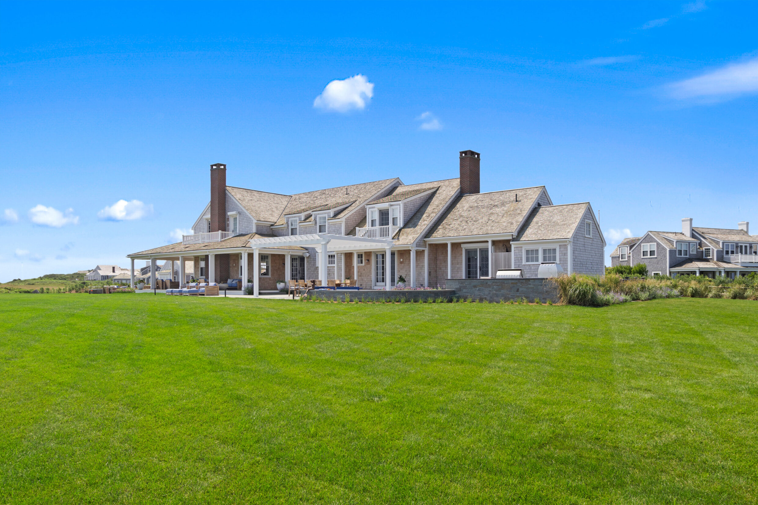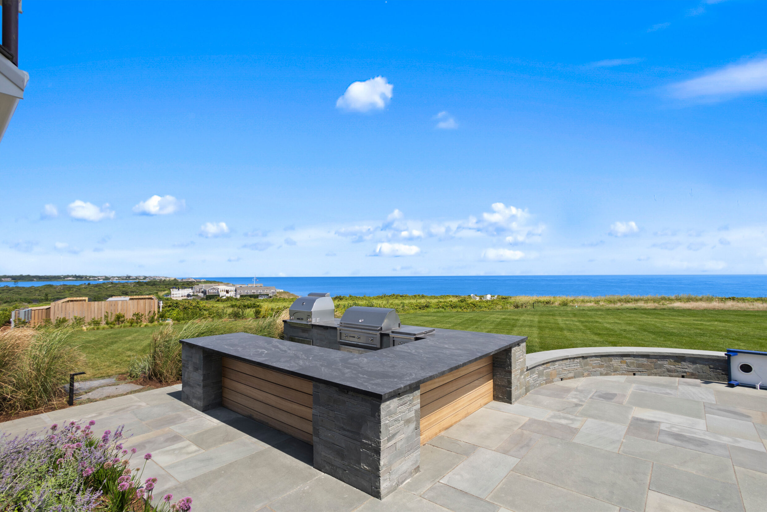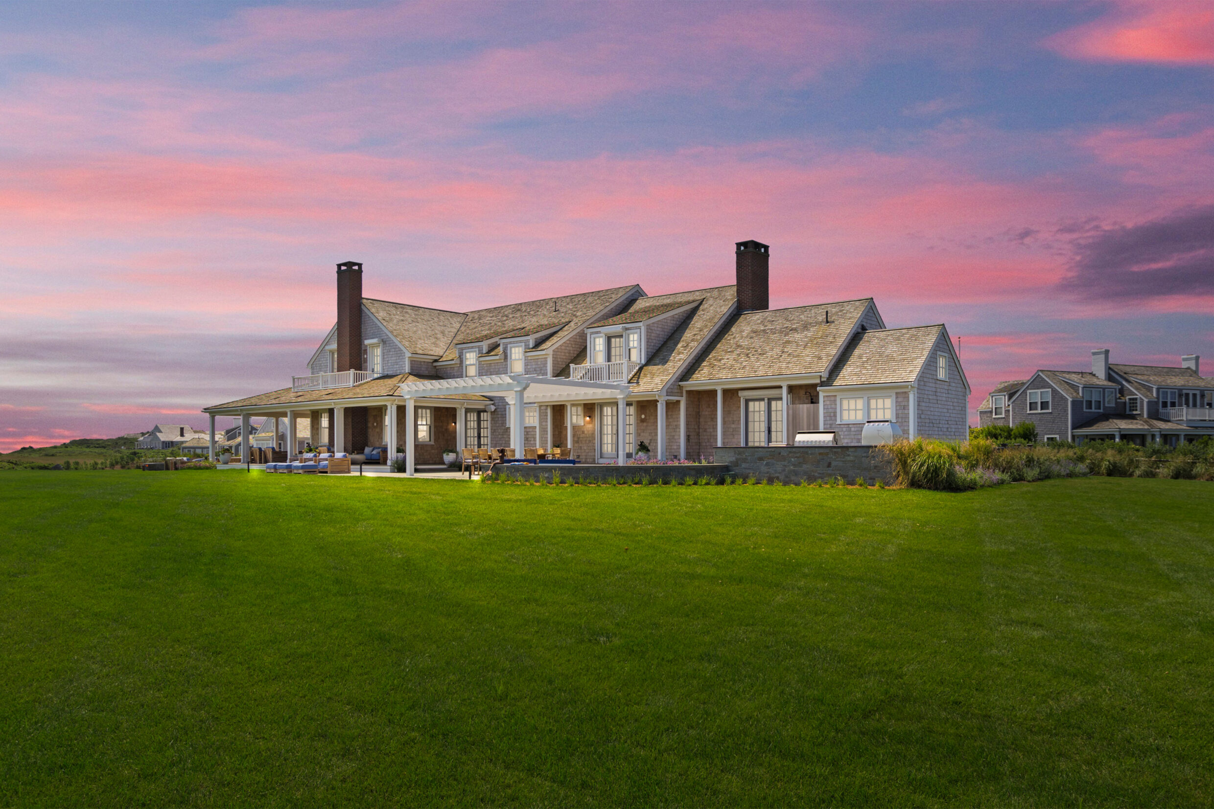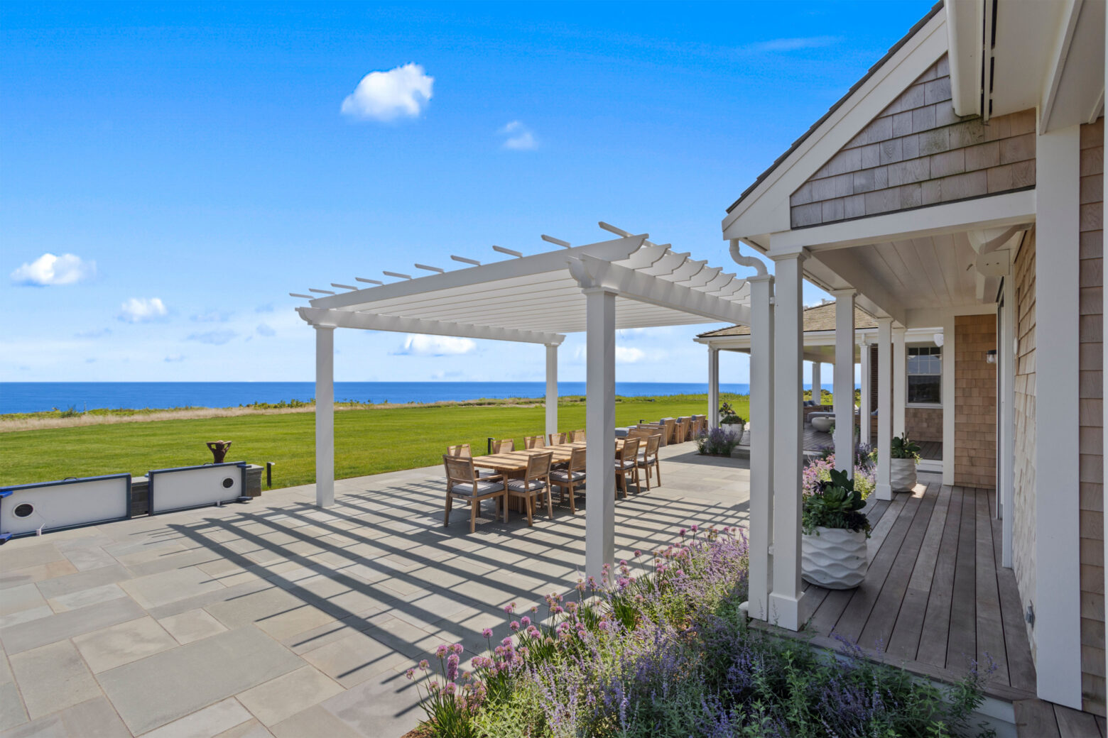 for evening gatherings beneath the coastal sky. A pergola-covered dining area and