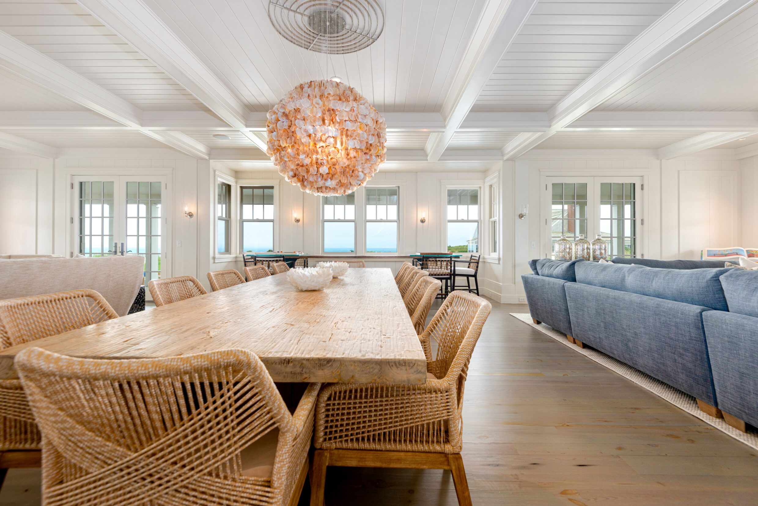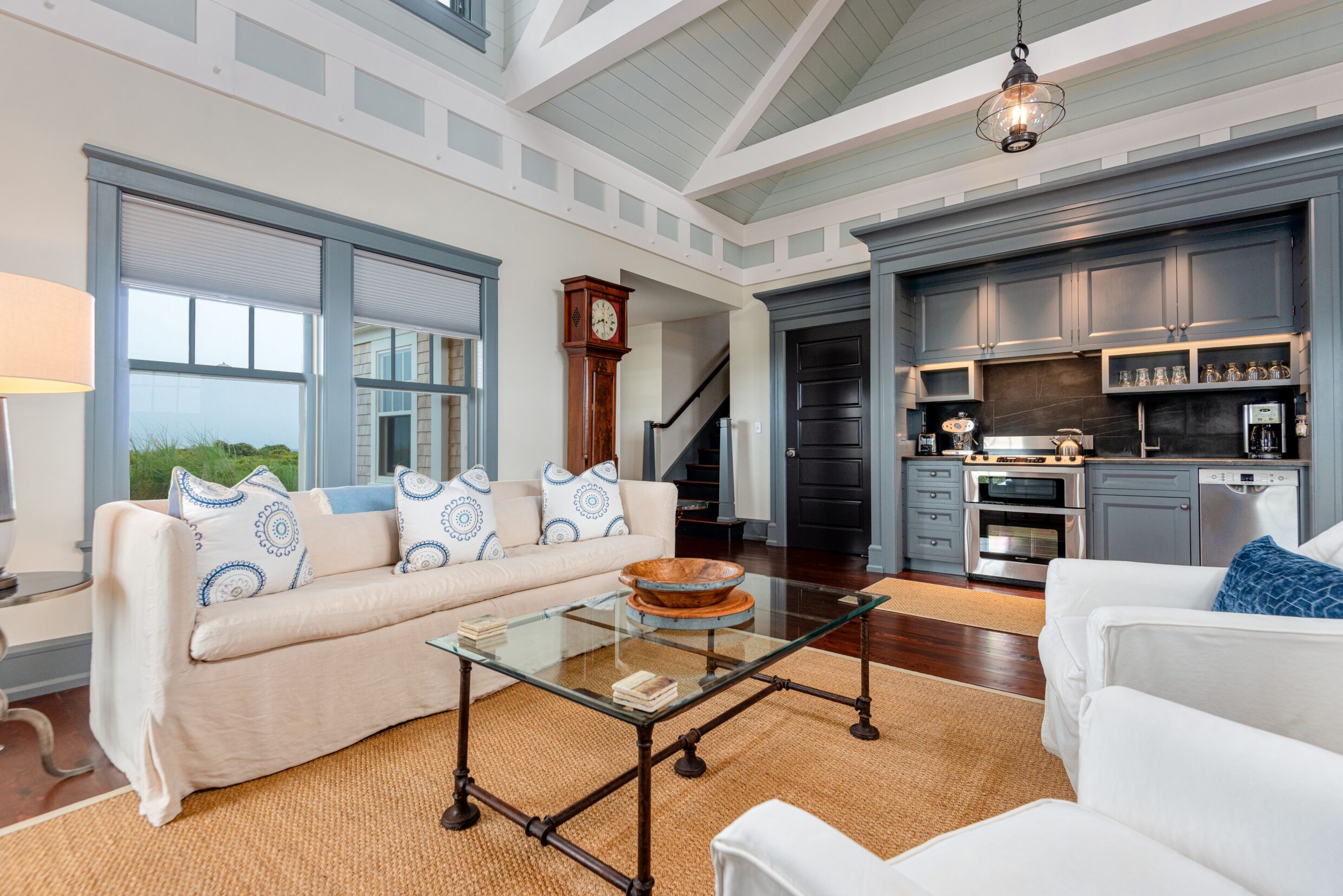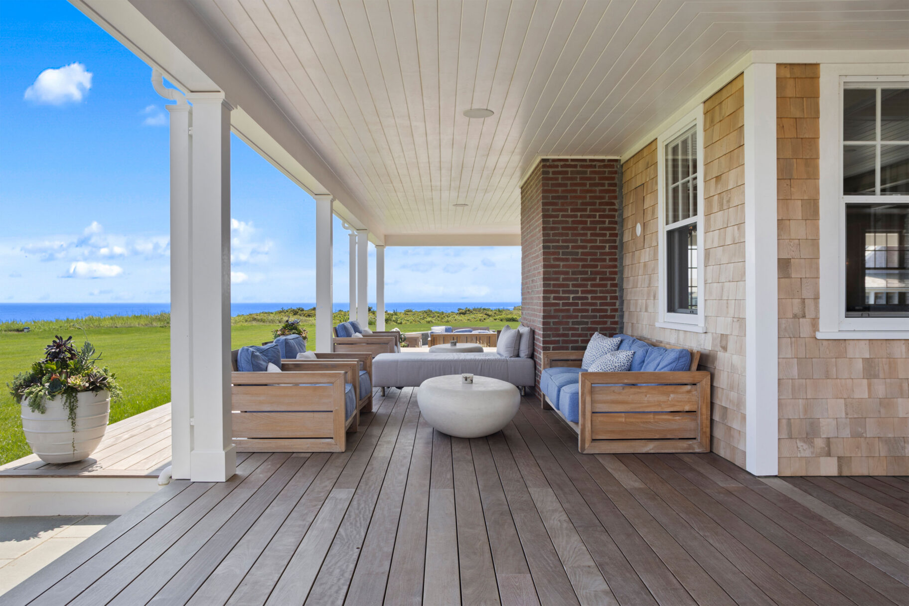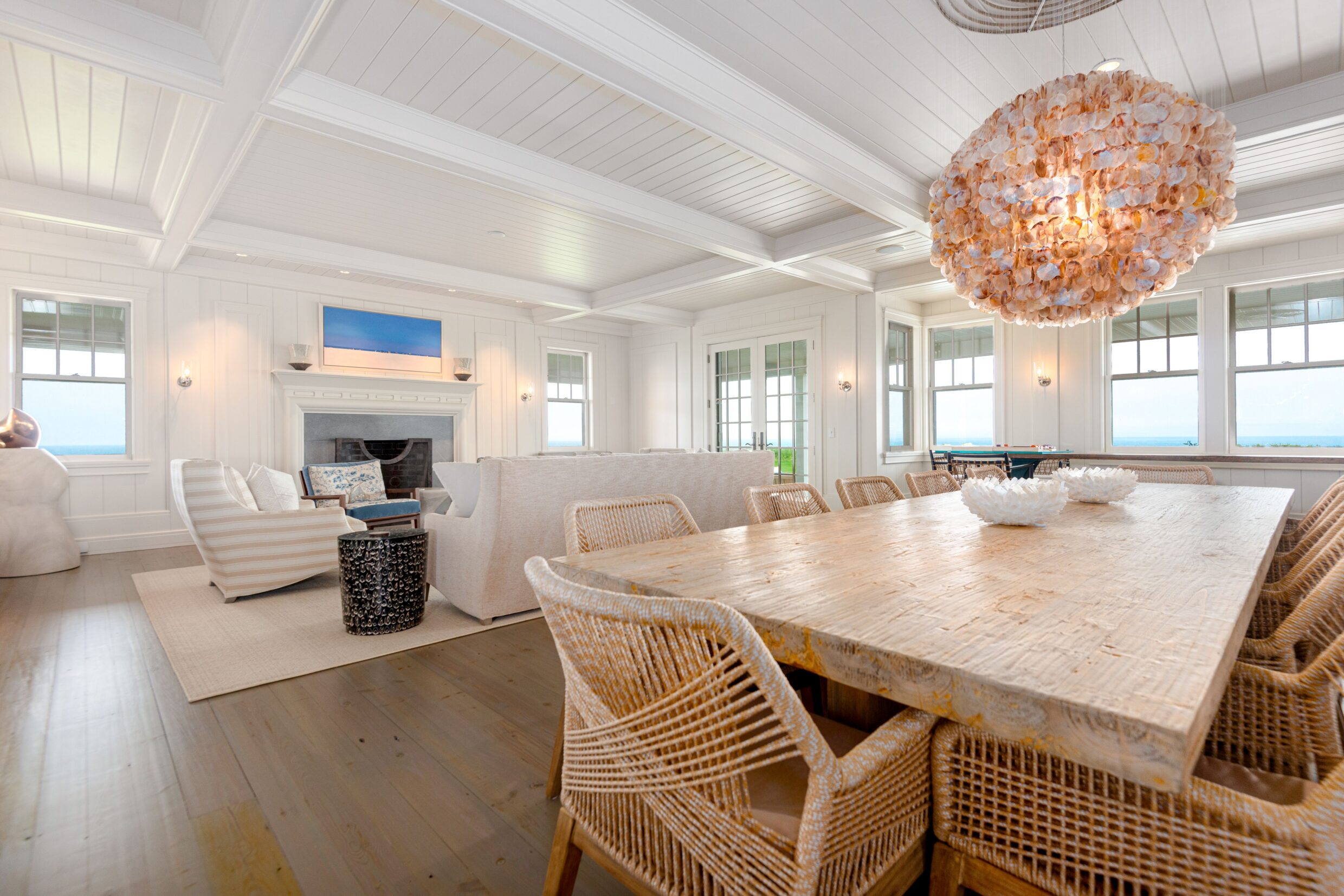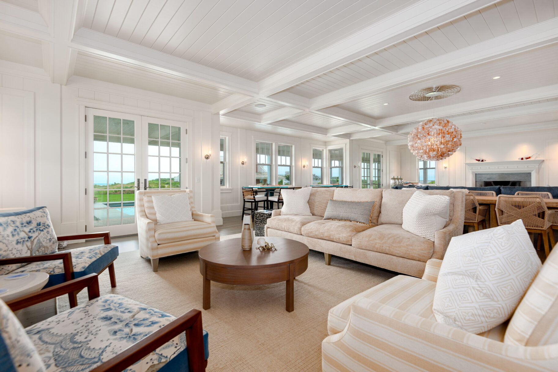 Designed with every principal room oriented toward the water, the first level captures the essence of elevated coastal living. A covered wrap-around porch encircles the home, while French doors from the living spaces open seamlessly to terraces and sweeping ocean vistas, dissolving the boundary between indoors and out.