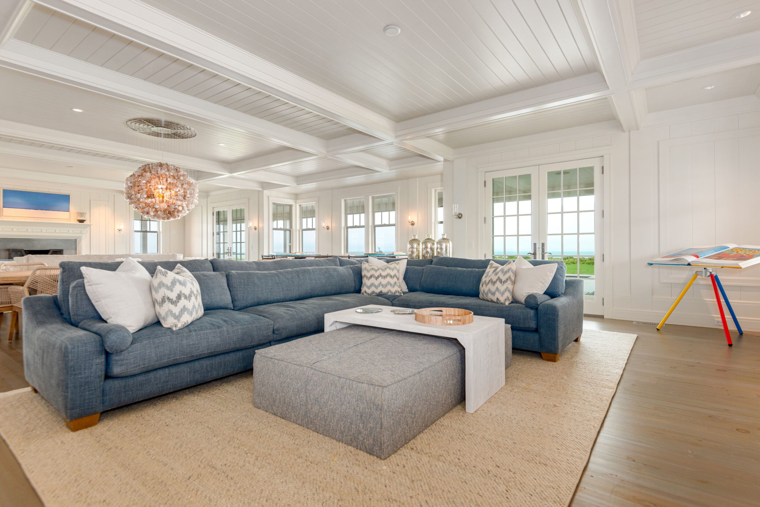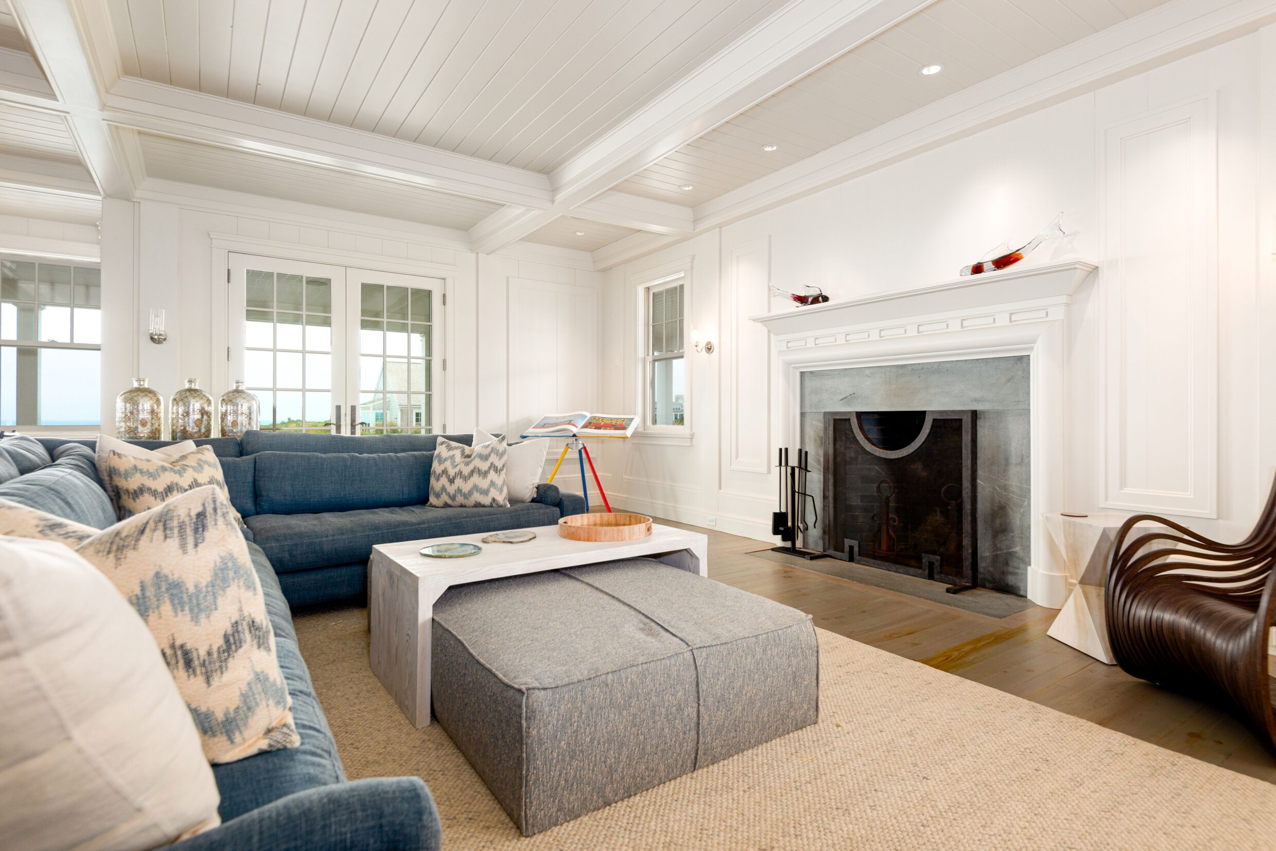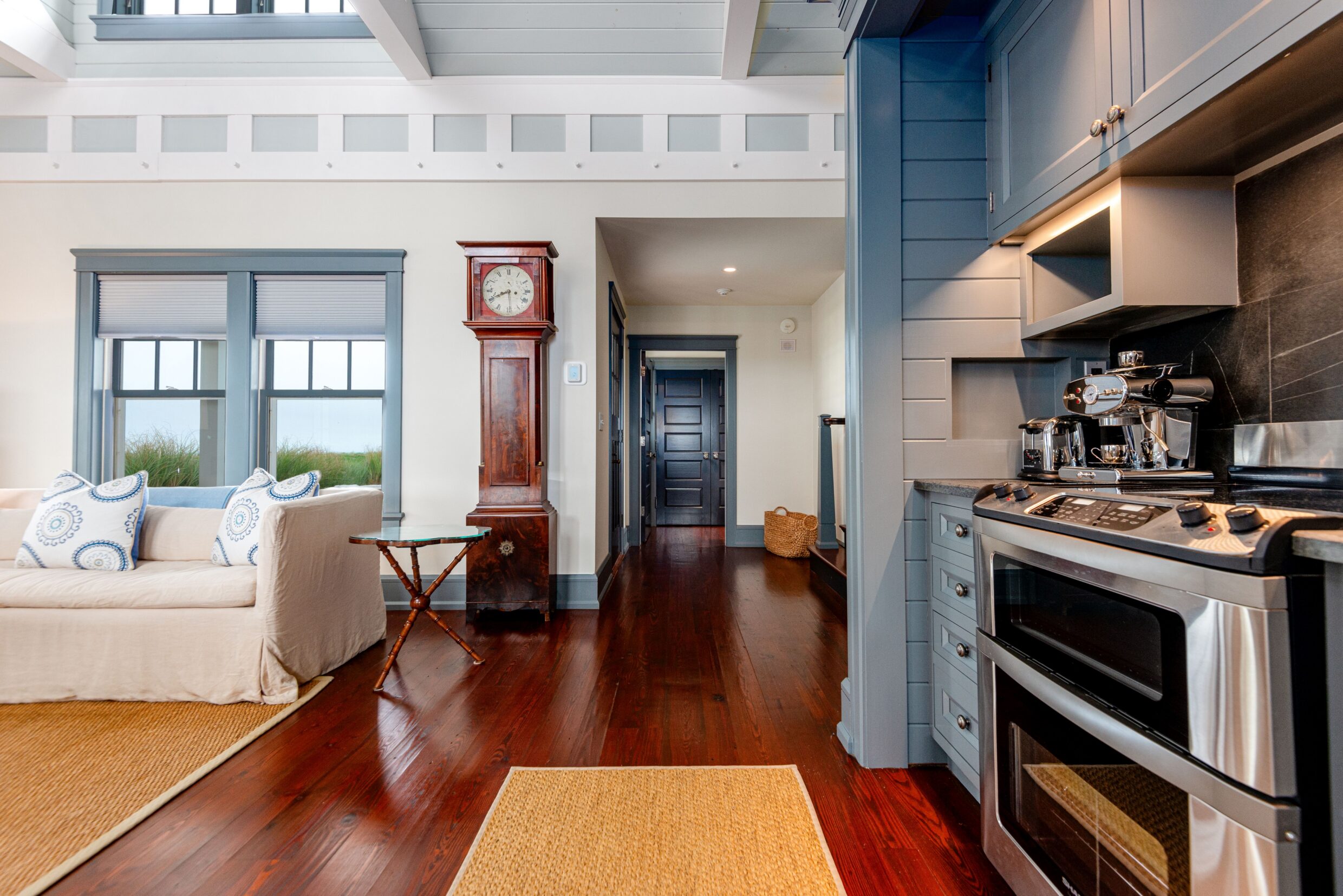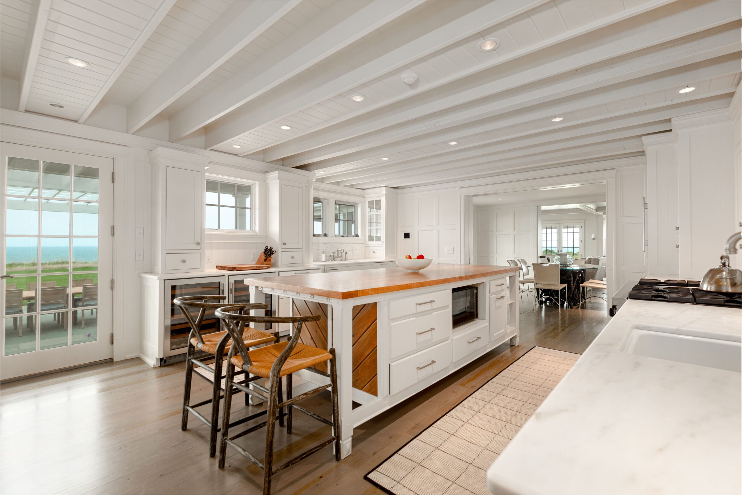 Designed with every principal room oriented toward the water, the first level captures the essence of elevated coastal living. A covered wrap-around porch encircles the home, while French doors from the living spaces open seamlessly to terraces and sweeping ocean vistas, dissolving the boundary between indoors and out.