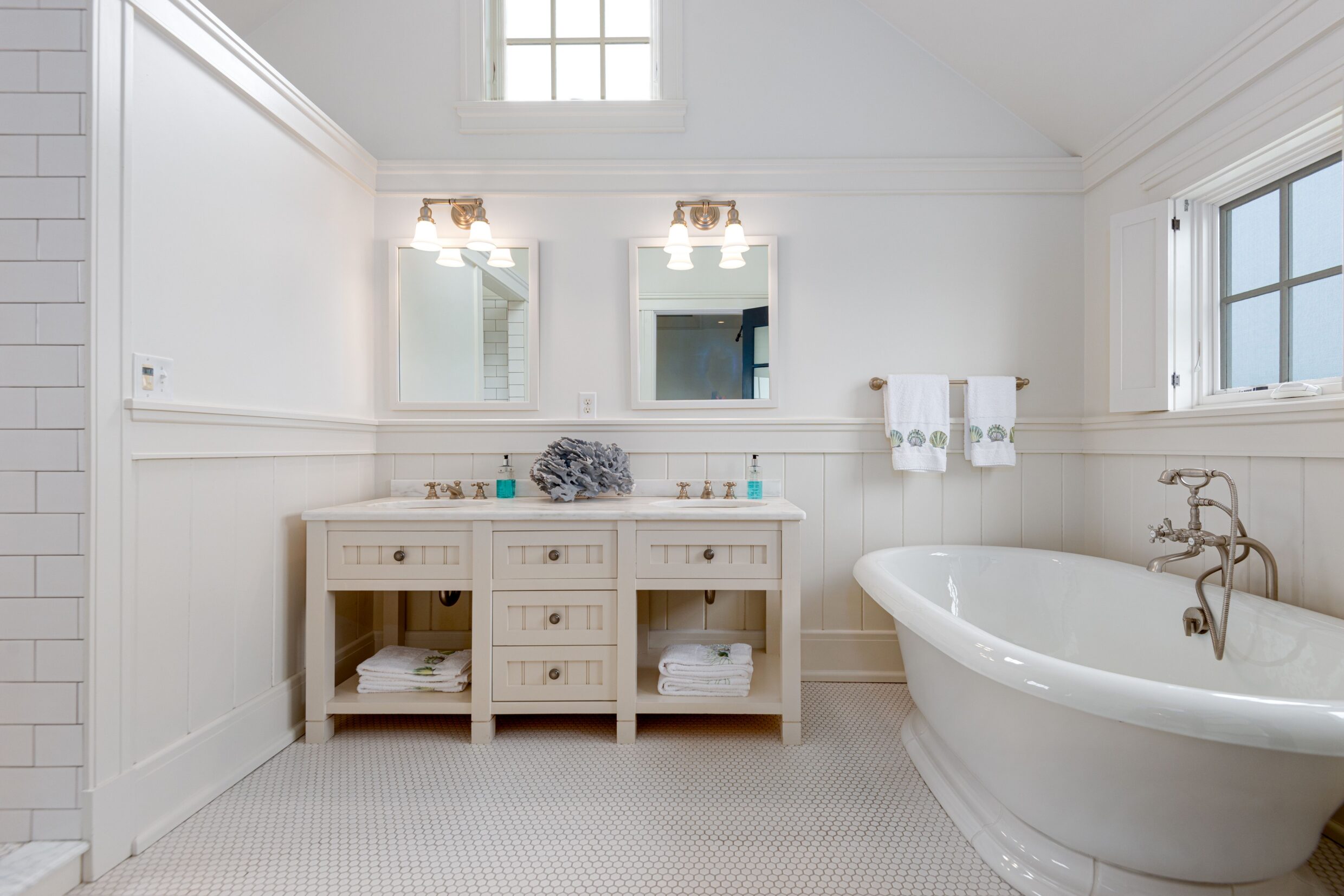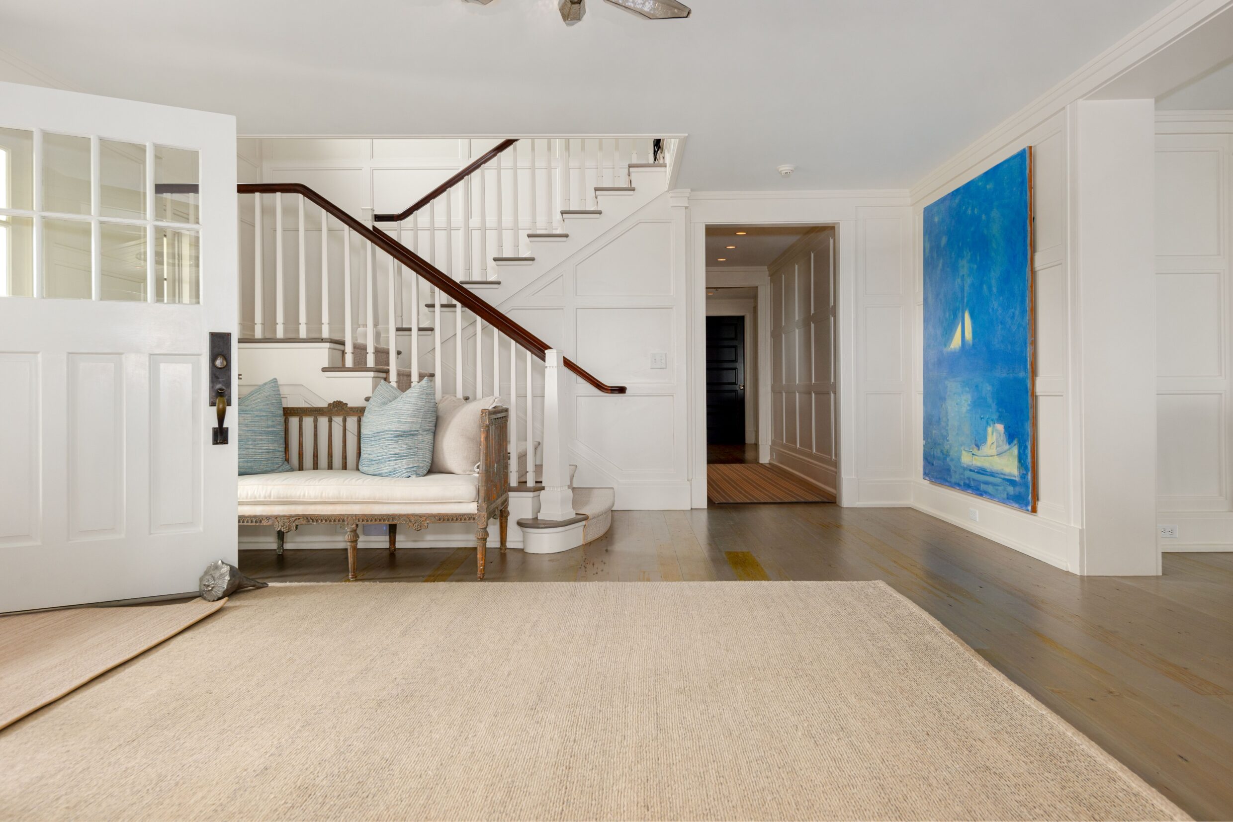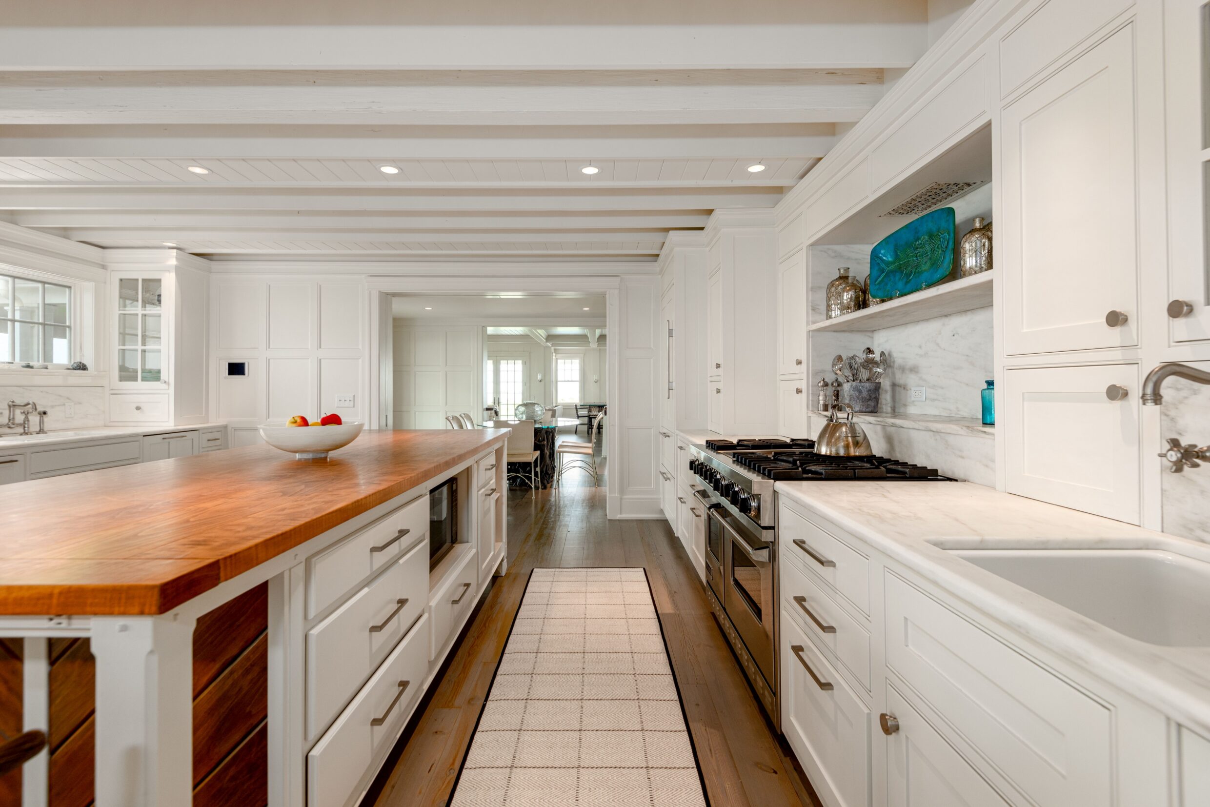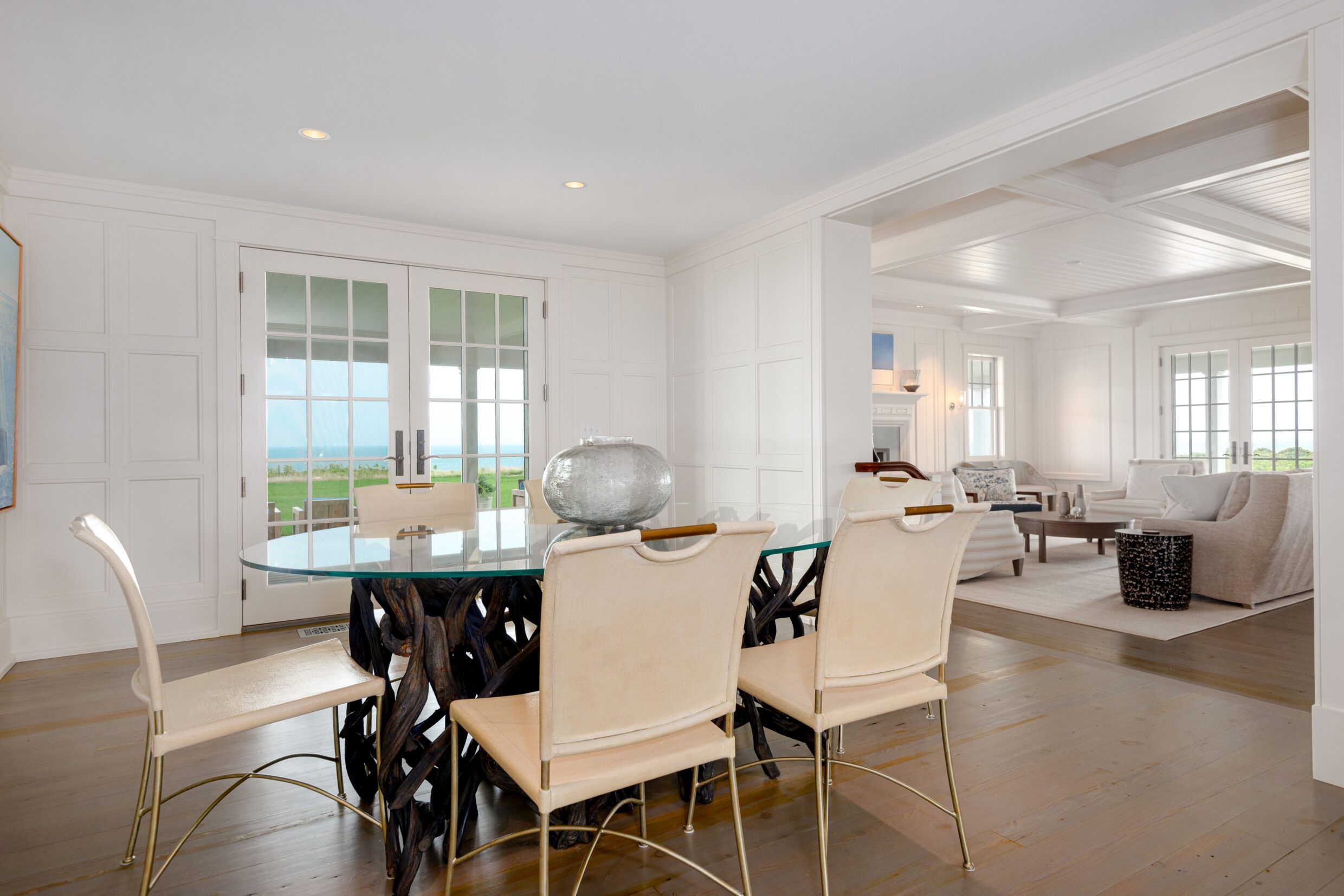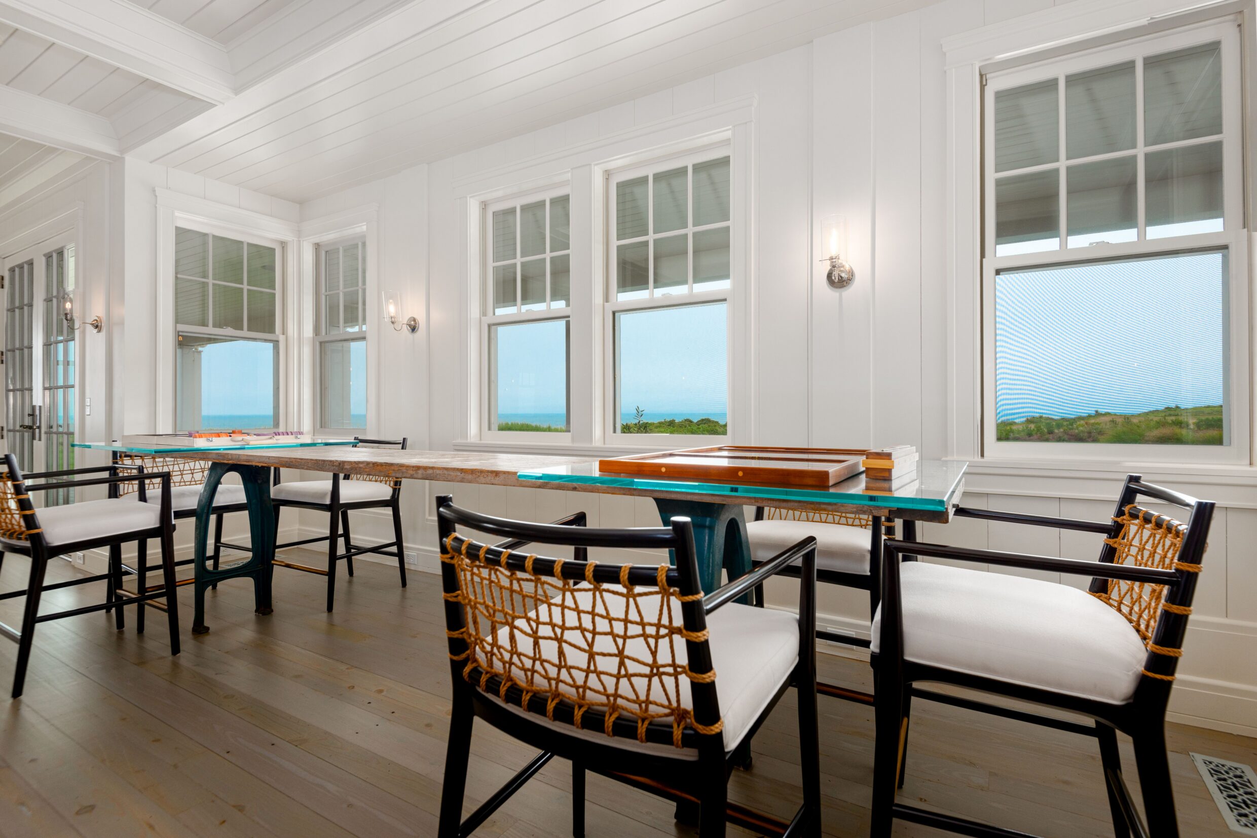 Designed with every principal room oriented toward the water, the first level captures the essence of elevated coastal living. A covered wrap-around porch encircles the home, while French doors from the living spaces open seamlessly to terraces and sweeping ocean vistas, dissolving the boundary between indoors and out.