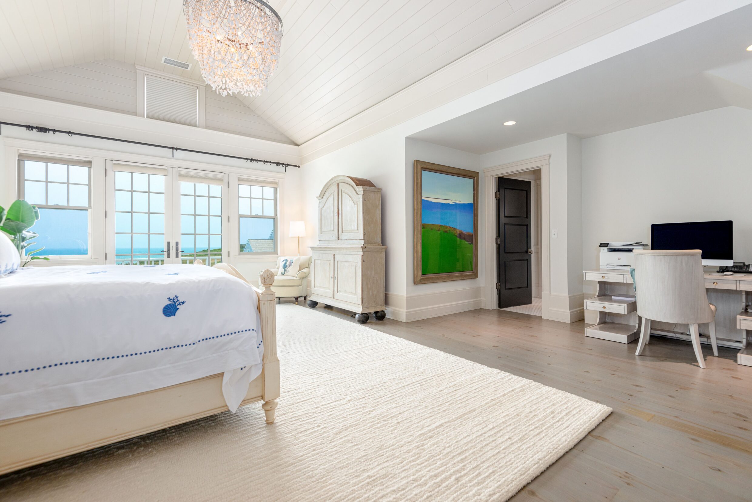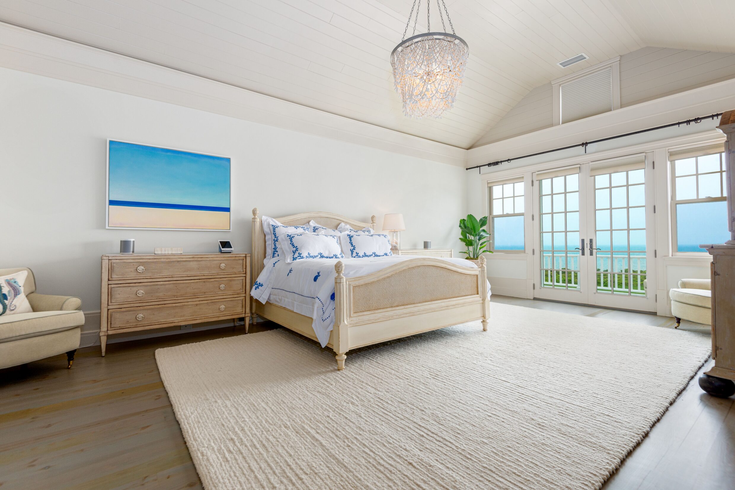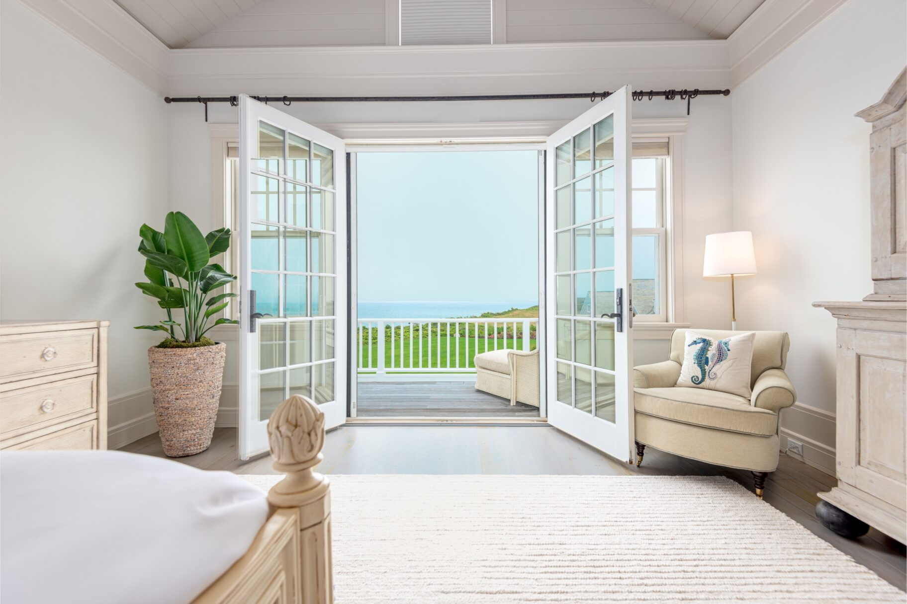 The second-level primary suite is defined by light, scale, and sweeping horizon views. French doors open to a private terrace overlooking the Atlantic, creating a serene retreat above the coastline.