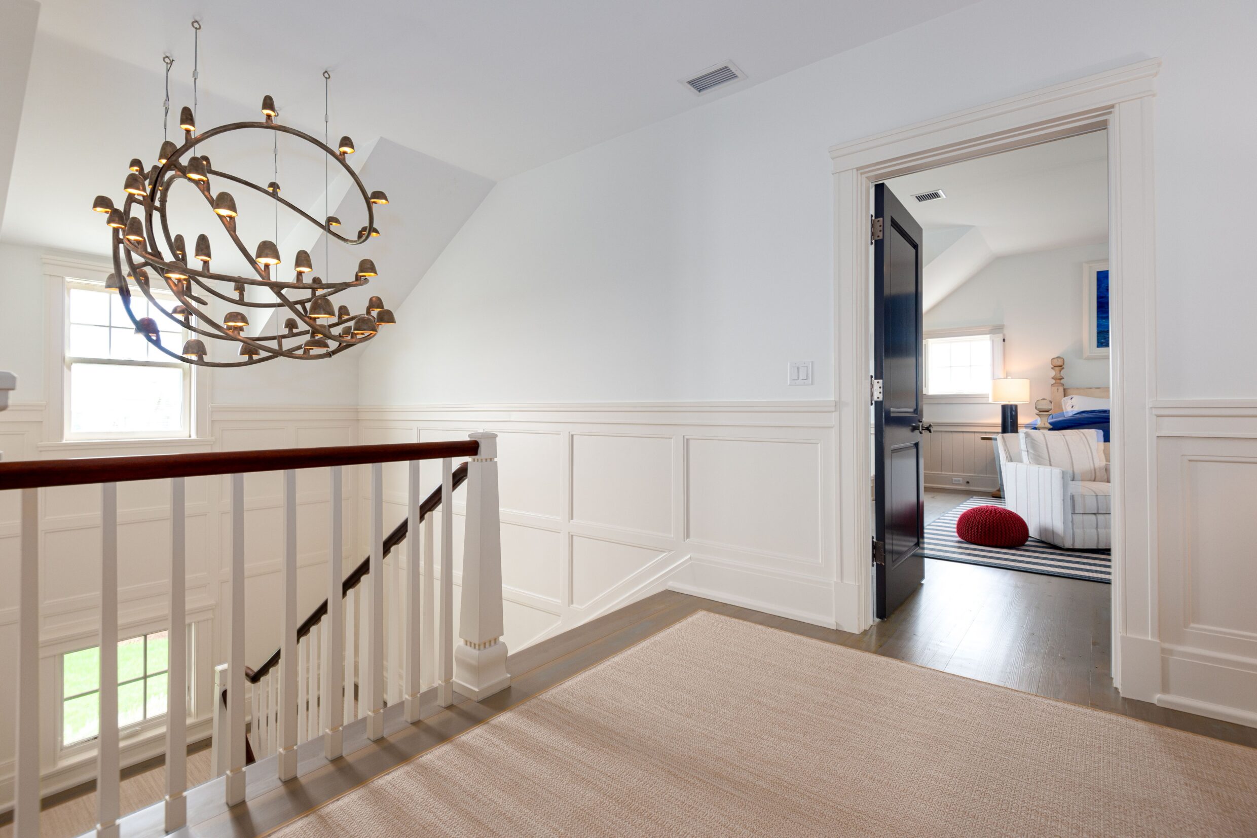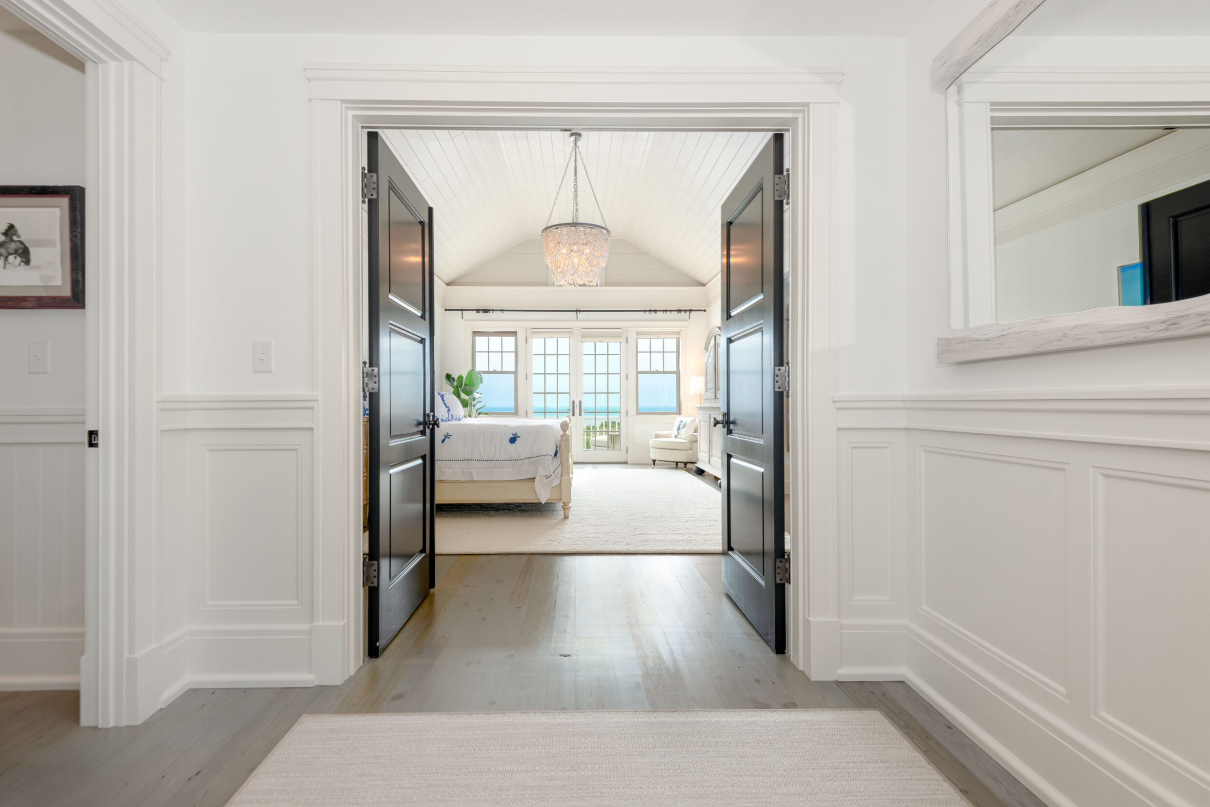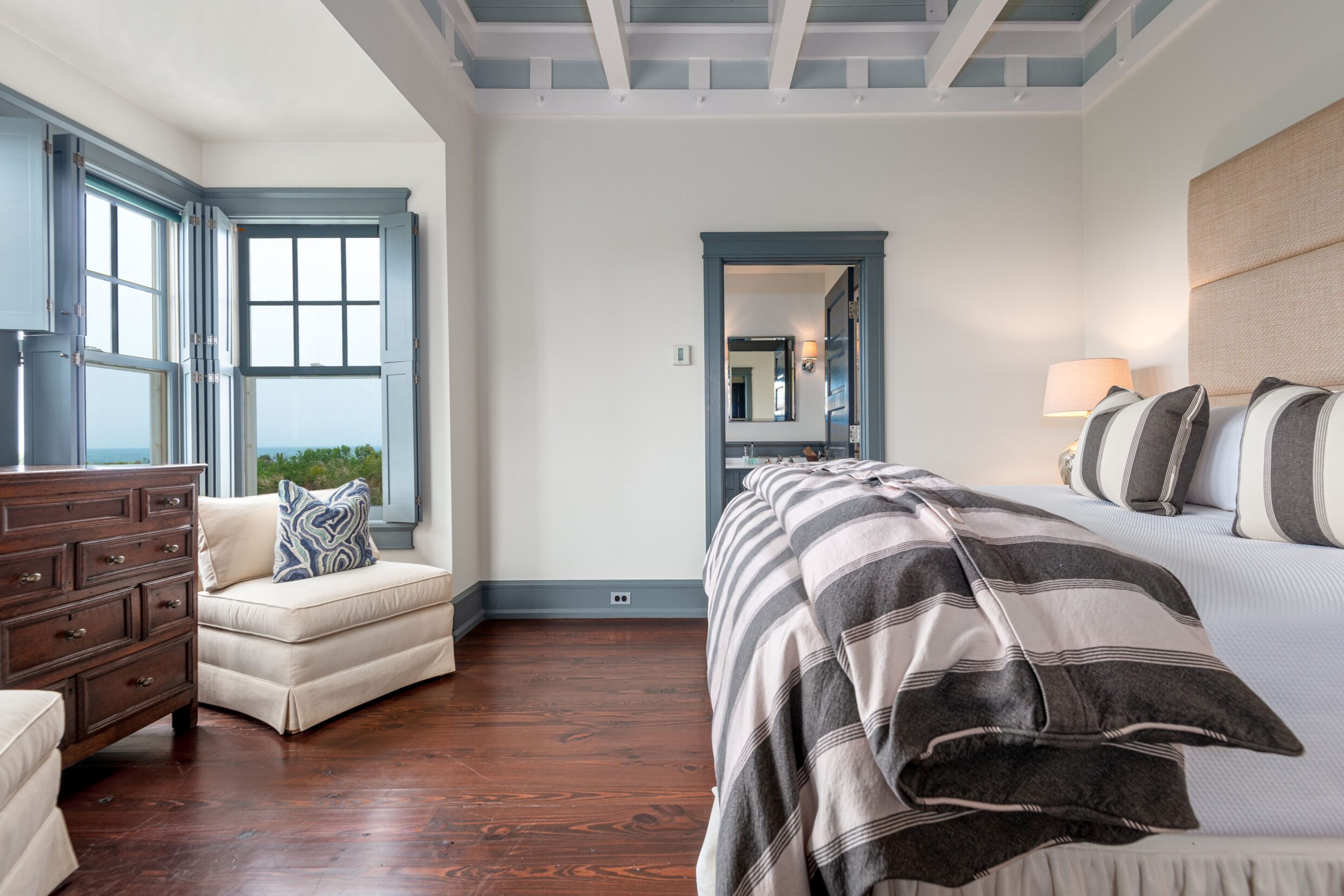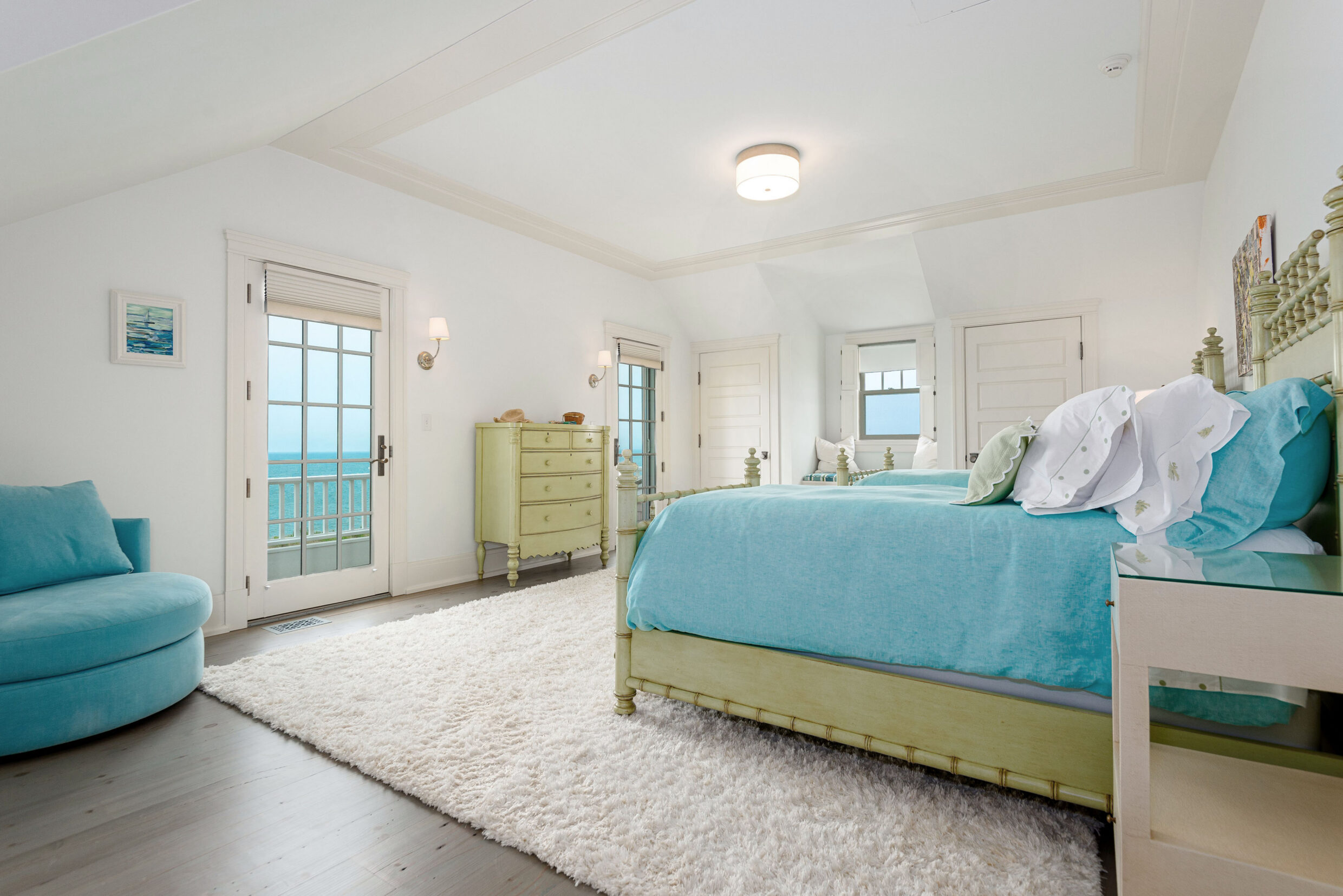 The second-level primary suite is defined by light, scale, and sweeping horizon views. French doors open to a private terrace overlooking the Atlantic, creating a serene retreat above the coastline.