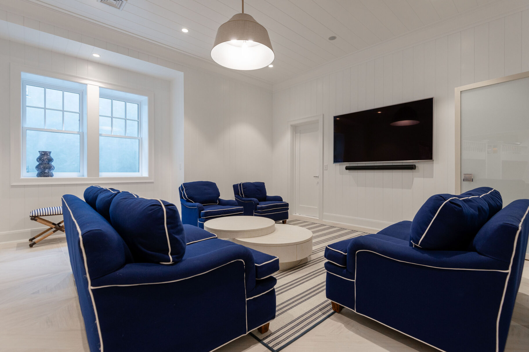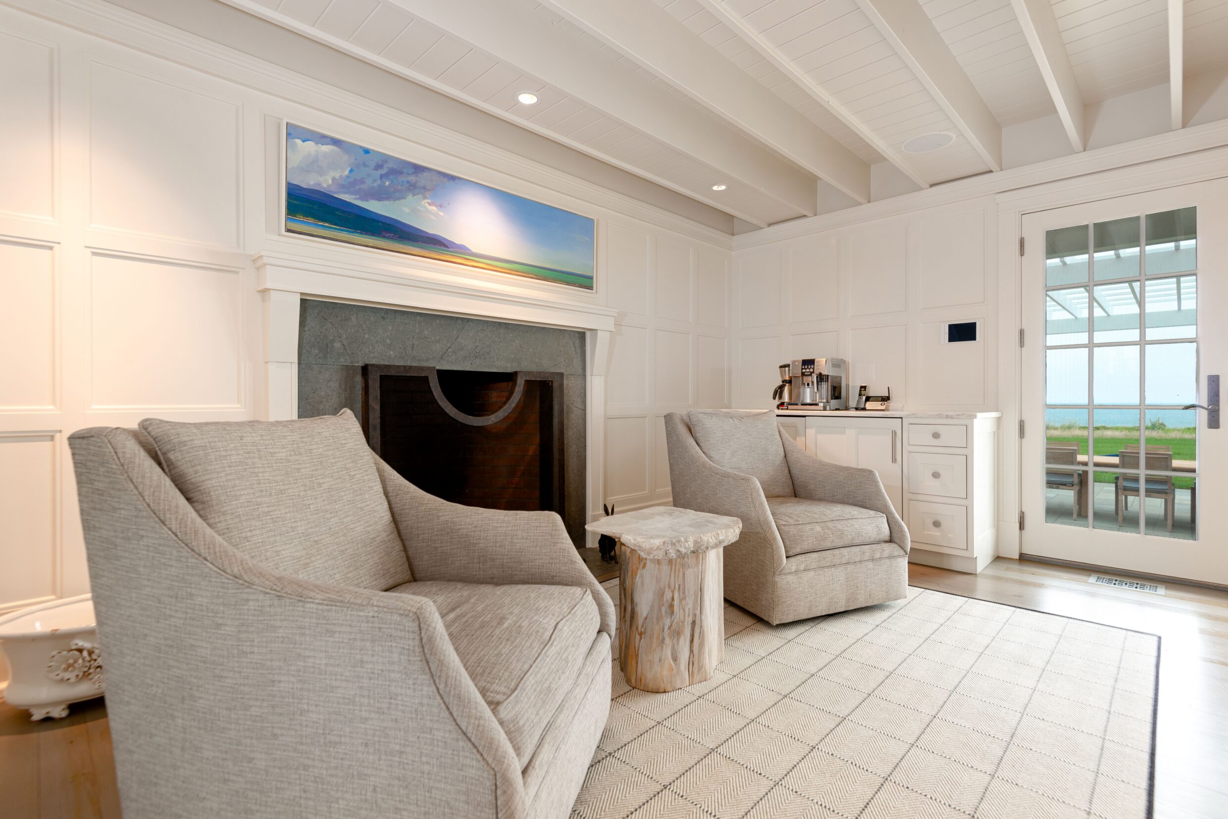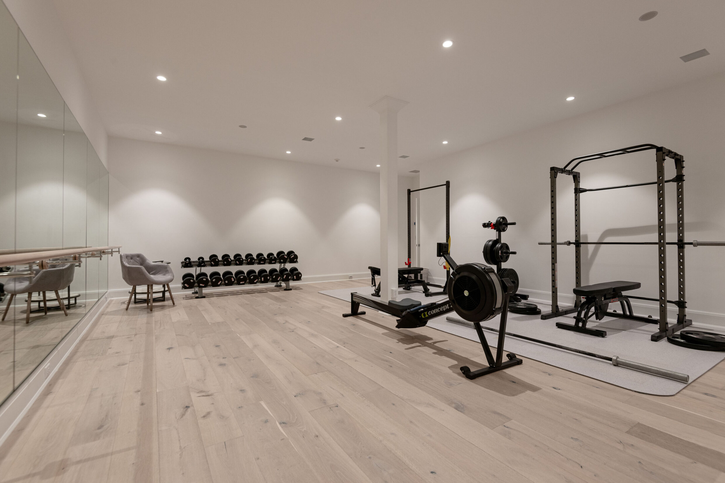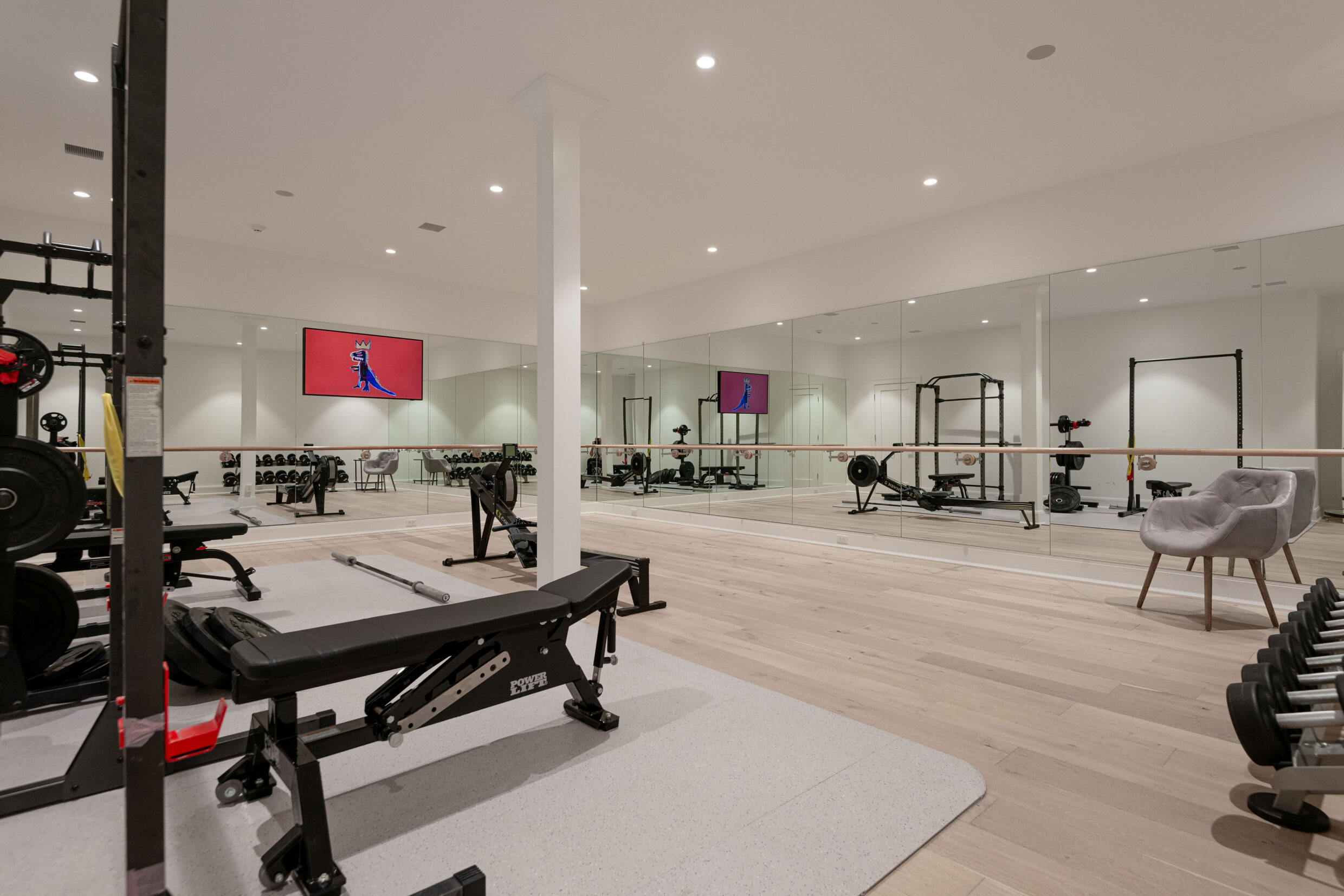 The finished lower level offers a flexible extension of the home’s living space. A wet bar with dual full-height wine refrigerators and ample storage anchors a comfortable sitting room ideal for gathering. A private gym with mirrored wall, bunk room, additional guest bedroom, two full bathrooms, and a laundry room complete this level.