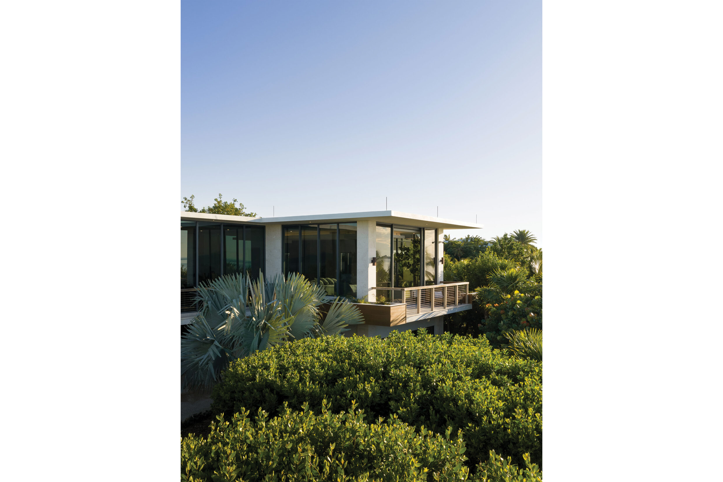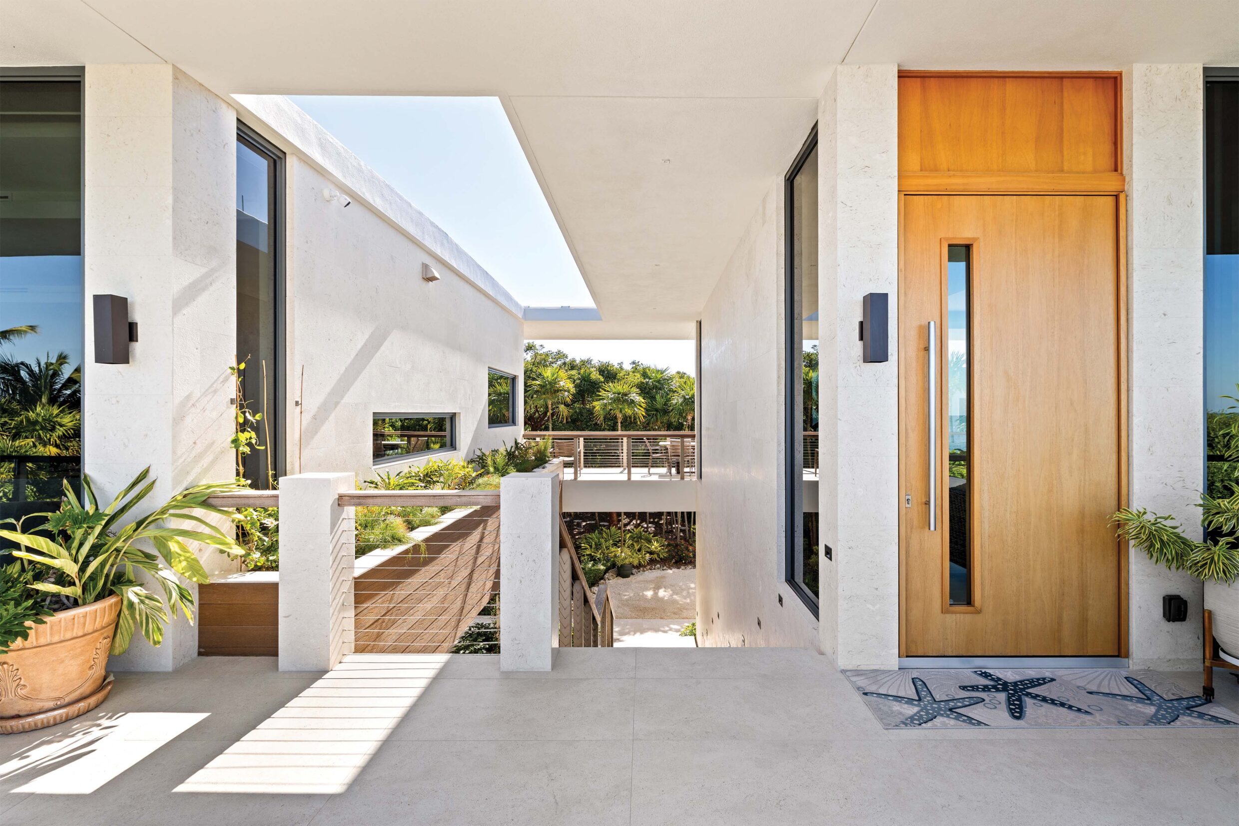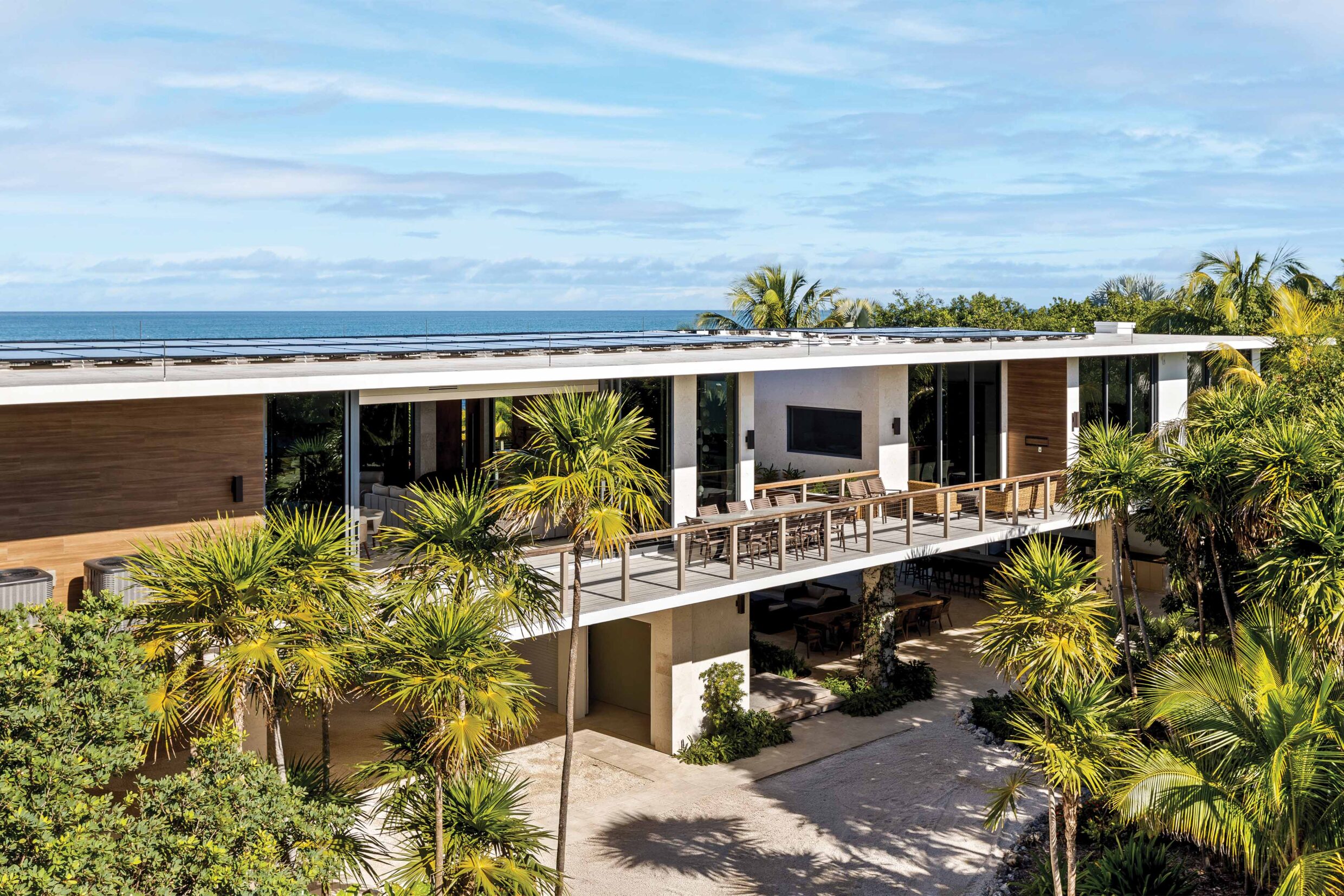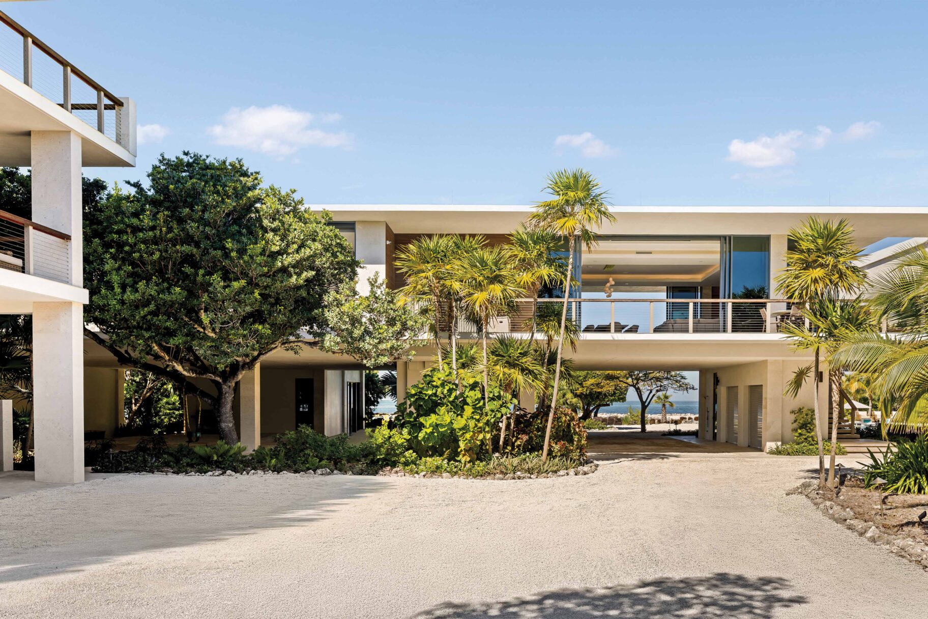 A long private drive winds through tropical landscape before opening to a modern waterfront compound featuring the main residence with its integrated pool cabana and a separate three-level guest house nestled within the trees. Each structure is oriented for Gulf views and privacy, establishing a calm, contemporary environment along the shoreline.