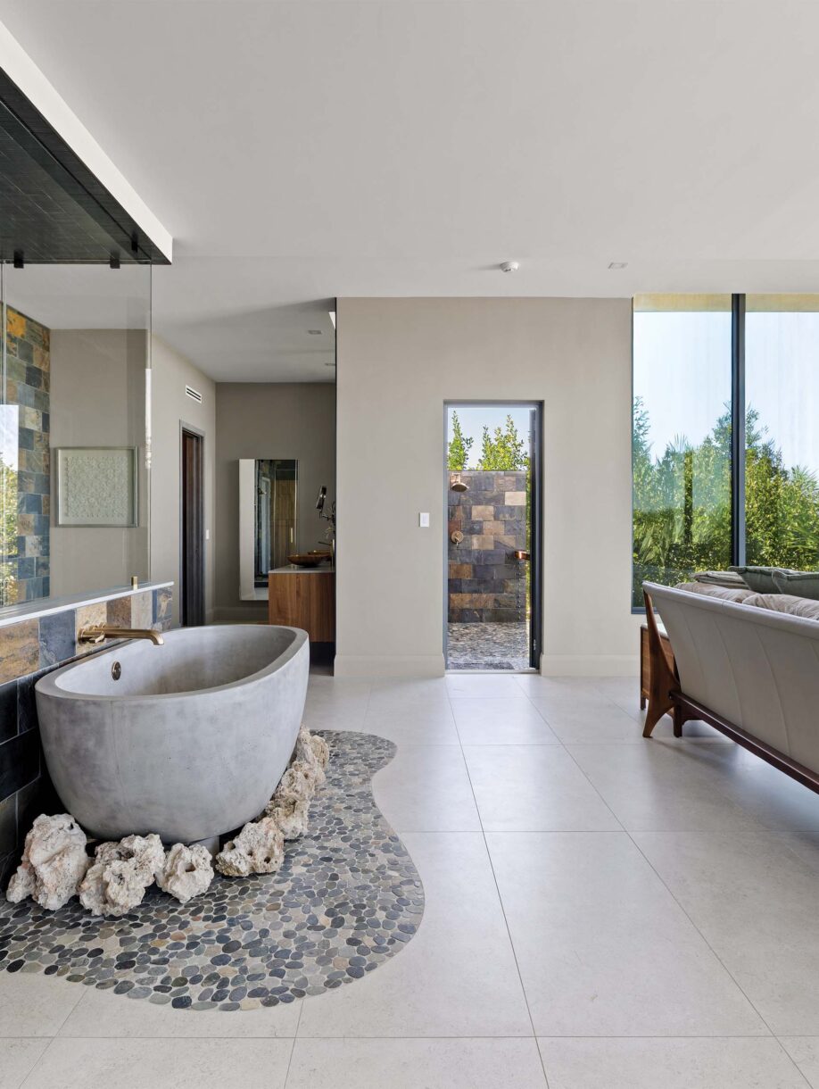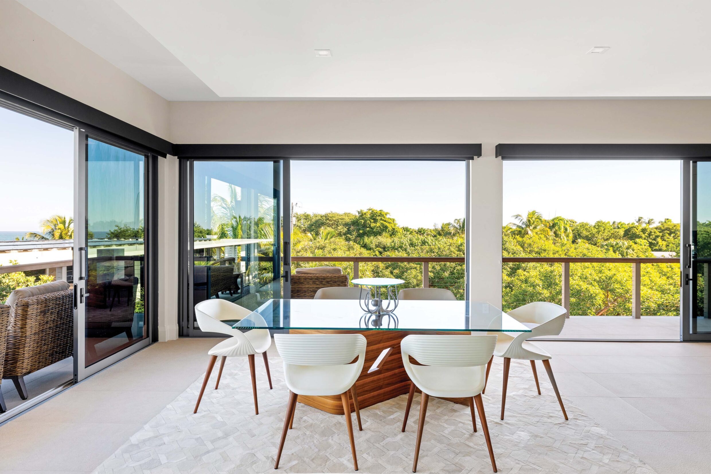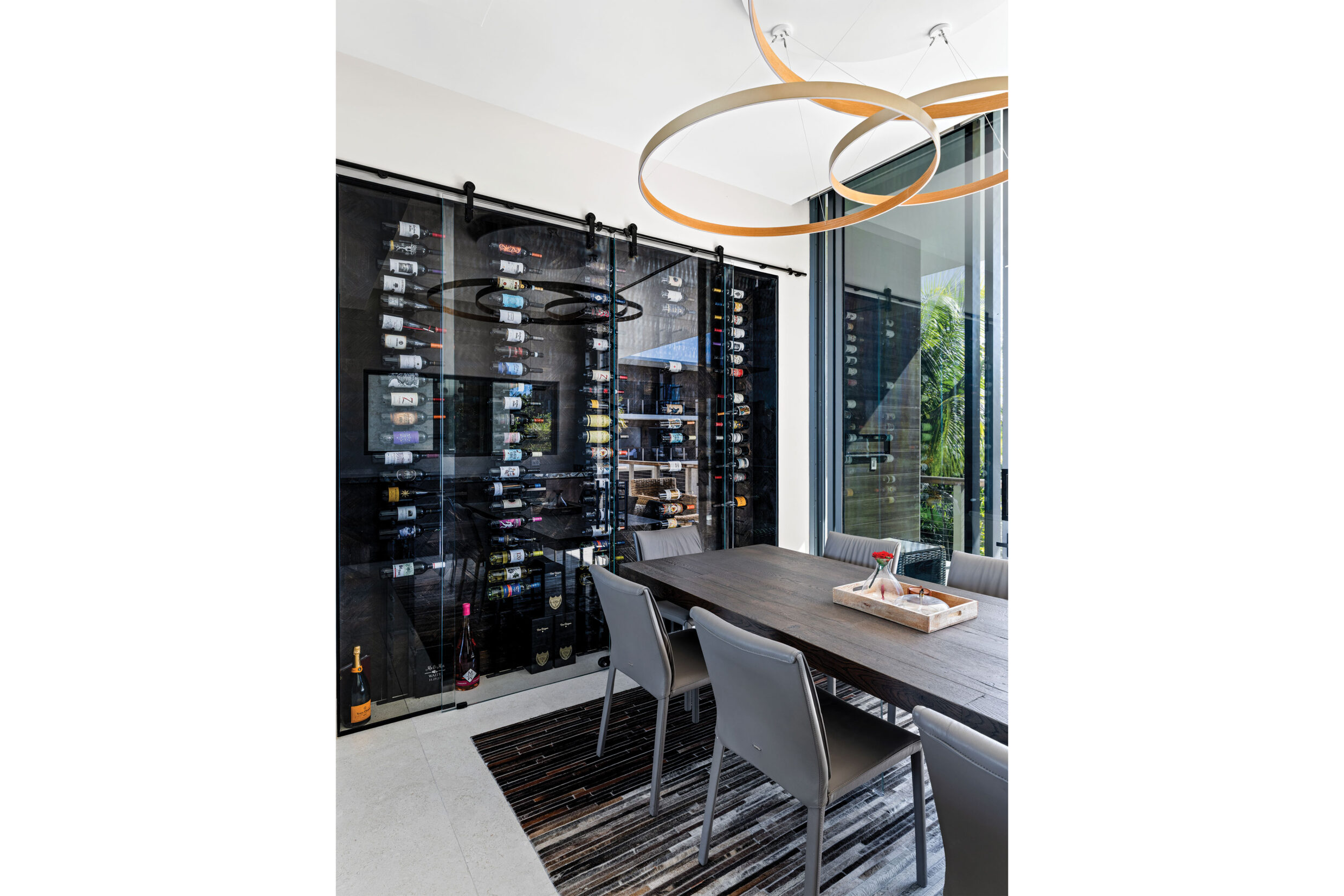 Connected yet independent, the attached pool cabana offers approximately 2,000 SF+/- of sun-filled living space with an open layout framed by floor-to-ceiling glass. The living and dining areas overlook the pool, terraces, and outdoor entertainment spaces, creating an easy flow between interior comfort and the surrounding landscape.