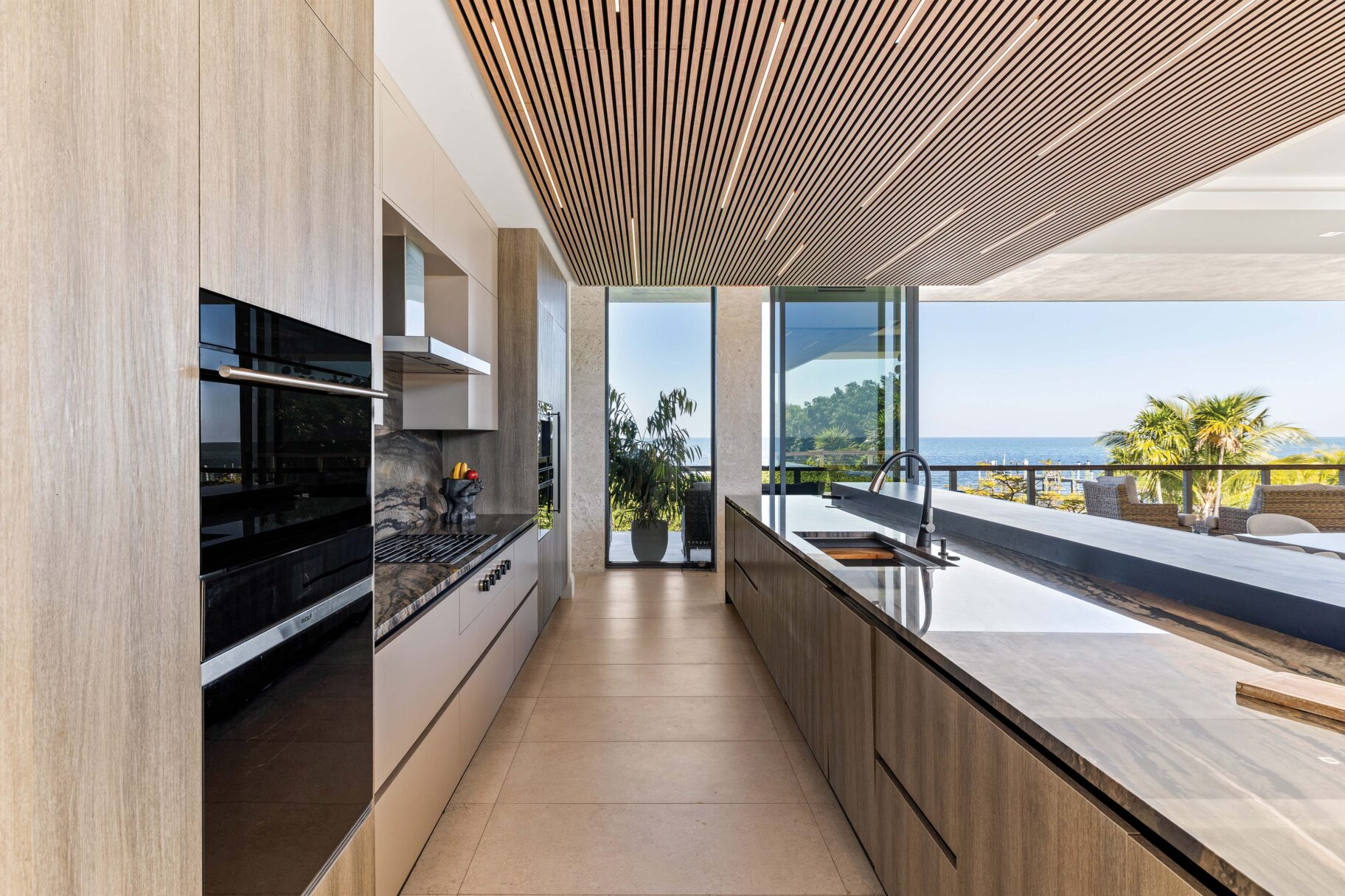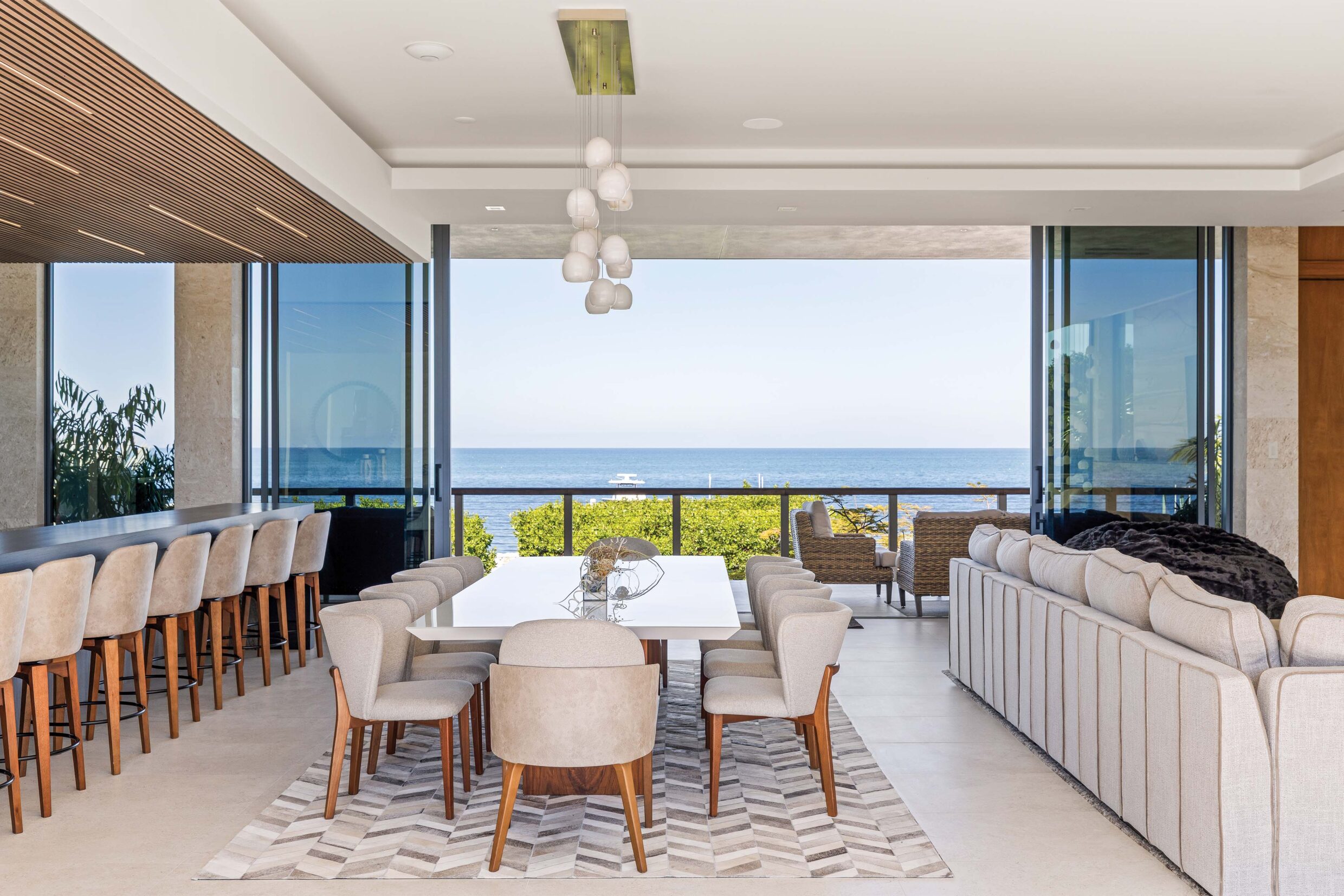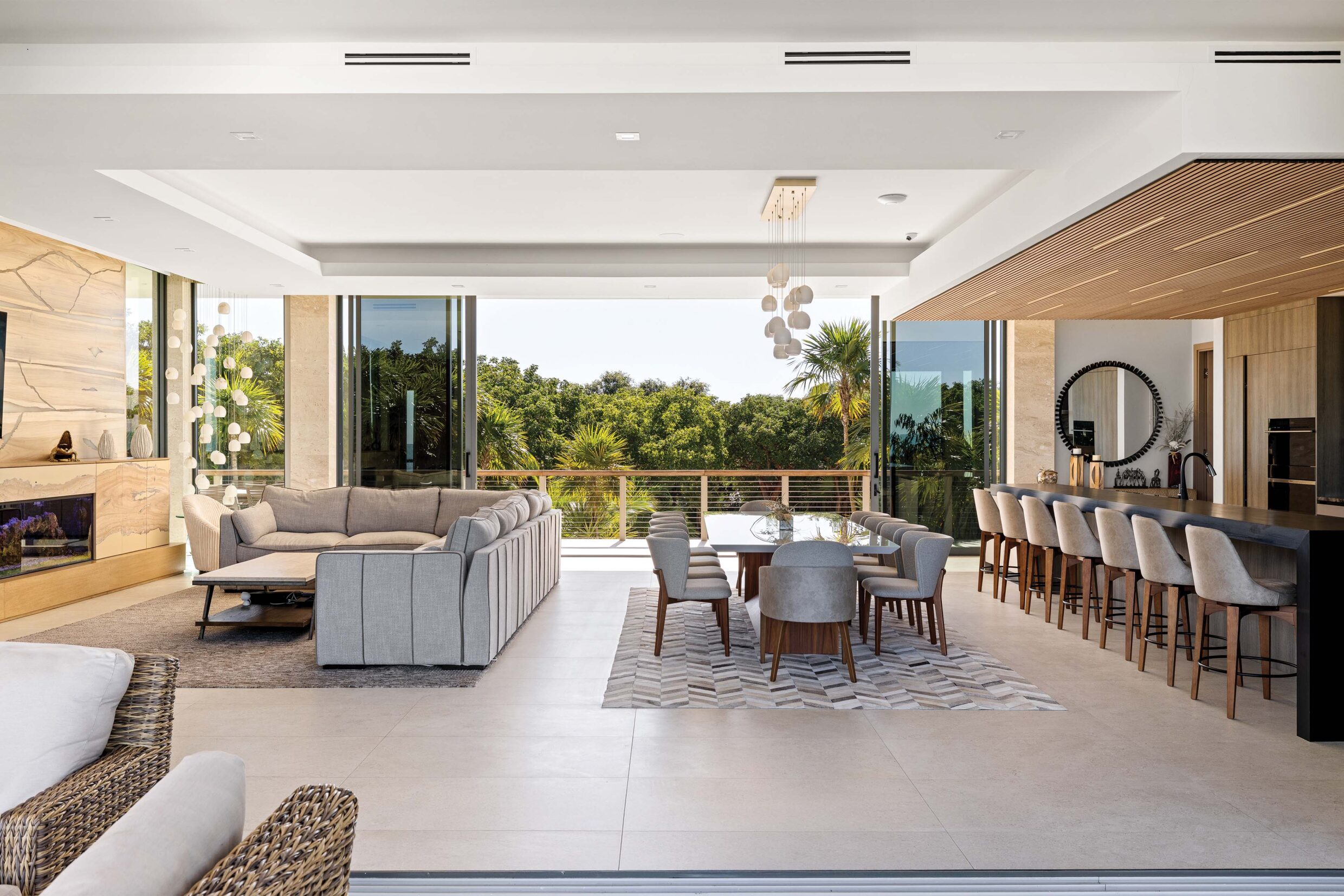 The main residence is wrapped in a continuous glass façade, opening every major room to sweeping Gulf views. At its center, the great room presents a bright, open layout for living, dining, and cooking, anchored by an elegant eat-in kitchen with a waterfall-edge island and a sculptural wood-slatted ceiling feature.