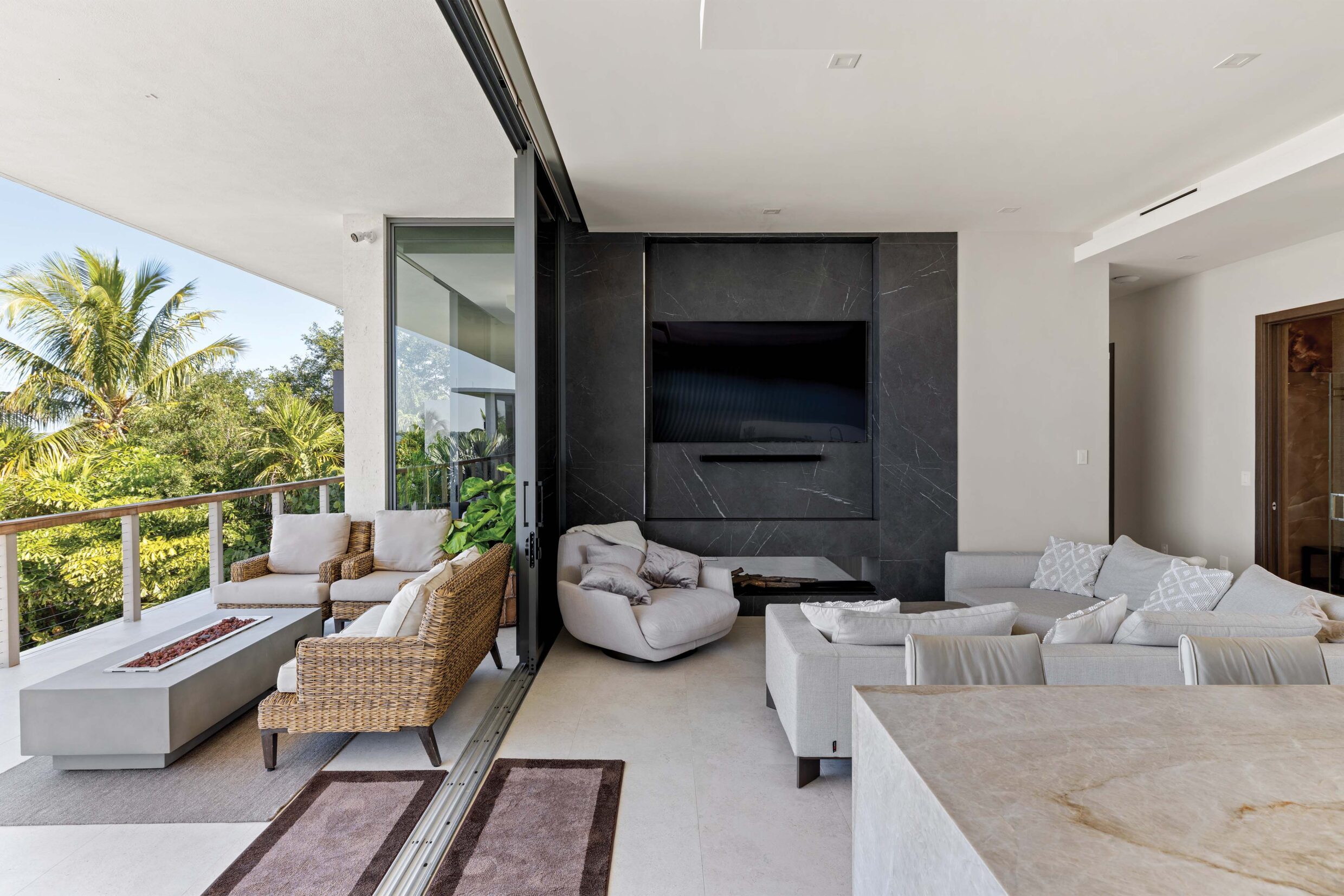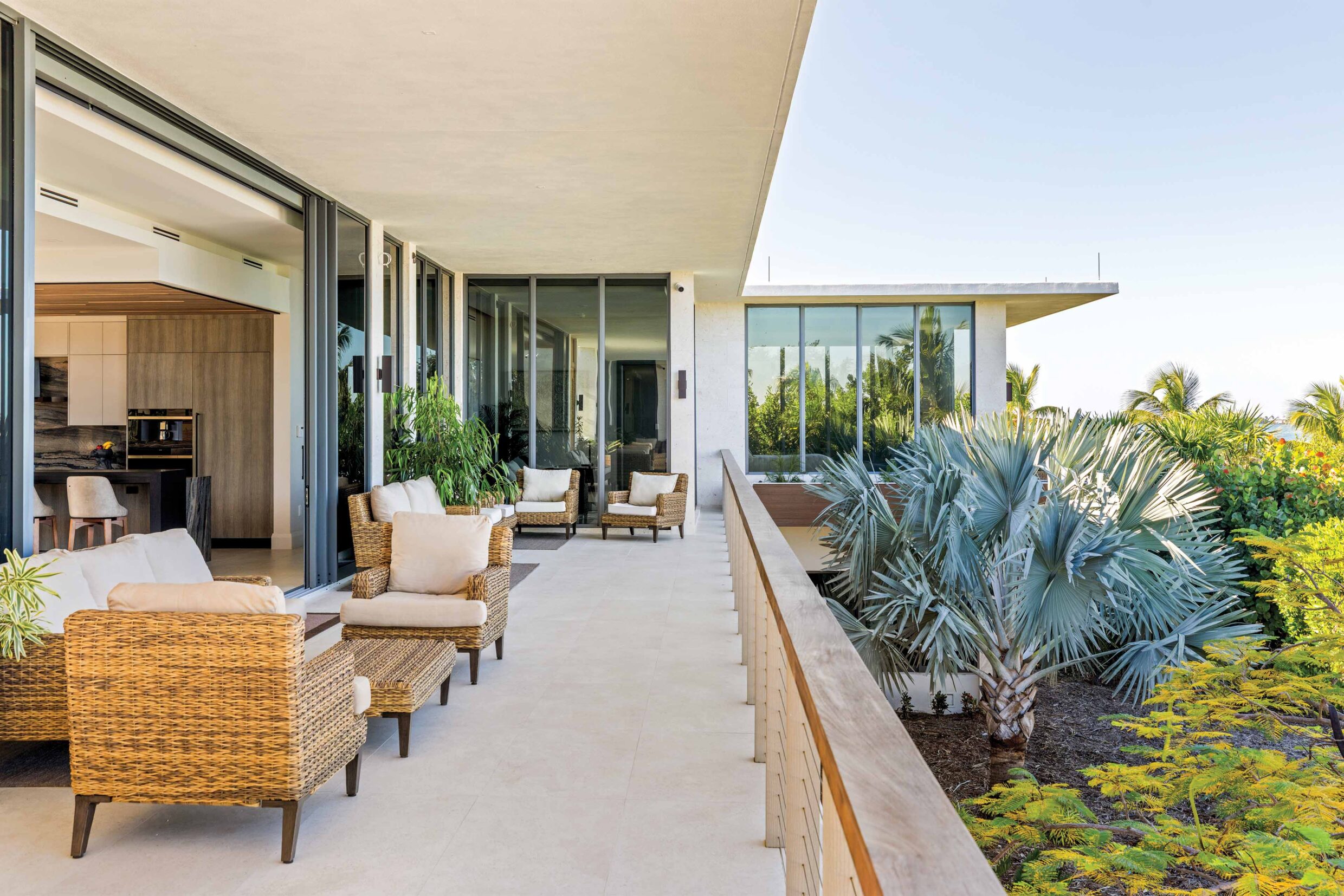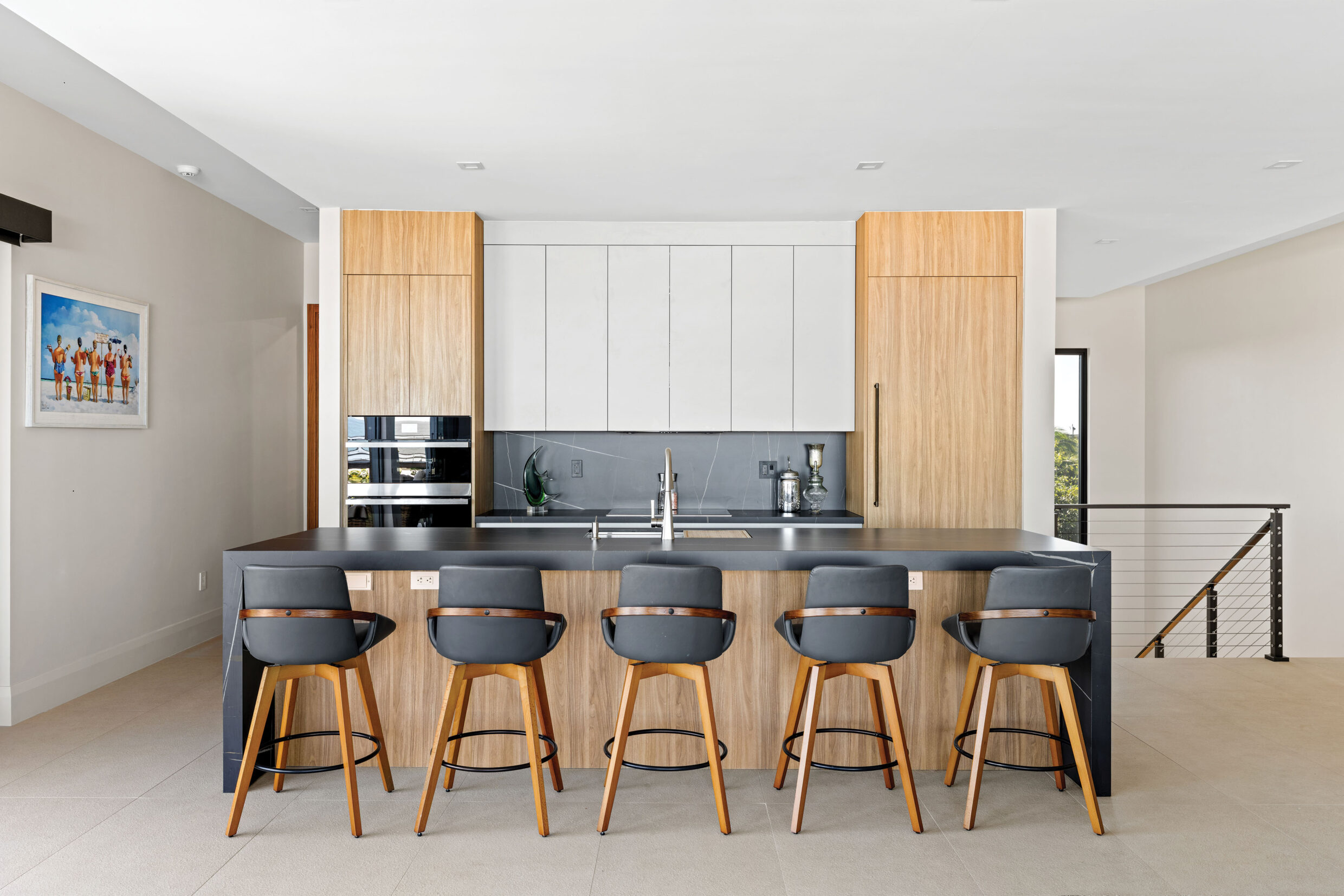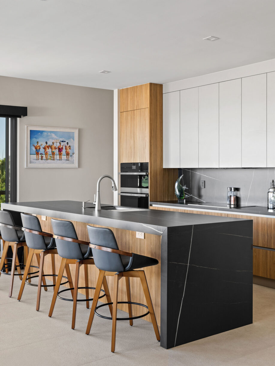 The main residence is wrapped in a continuous glass façade, opening every major room to sweeping Gulf views. At its center, the great room presents a bright, open layout for living, dining, and cooking, anchored by an elegant eat-in kitchen with a waterfall-edge island and a sculptural wood-slatted ceiling feature.