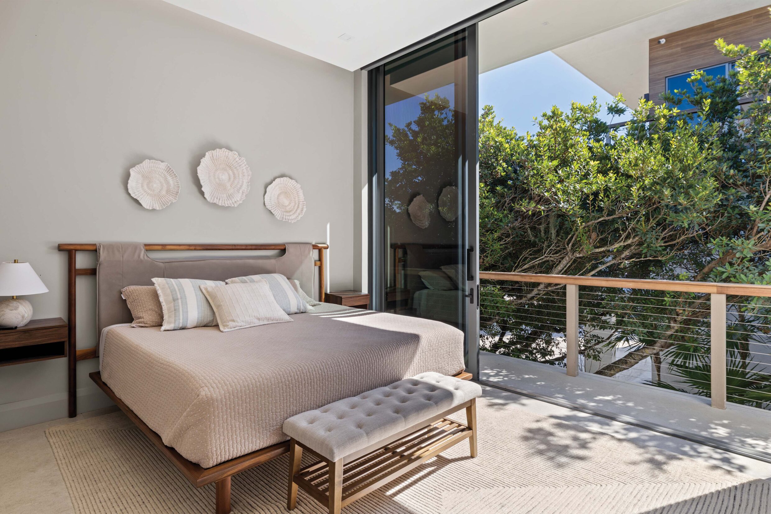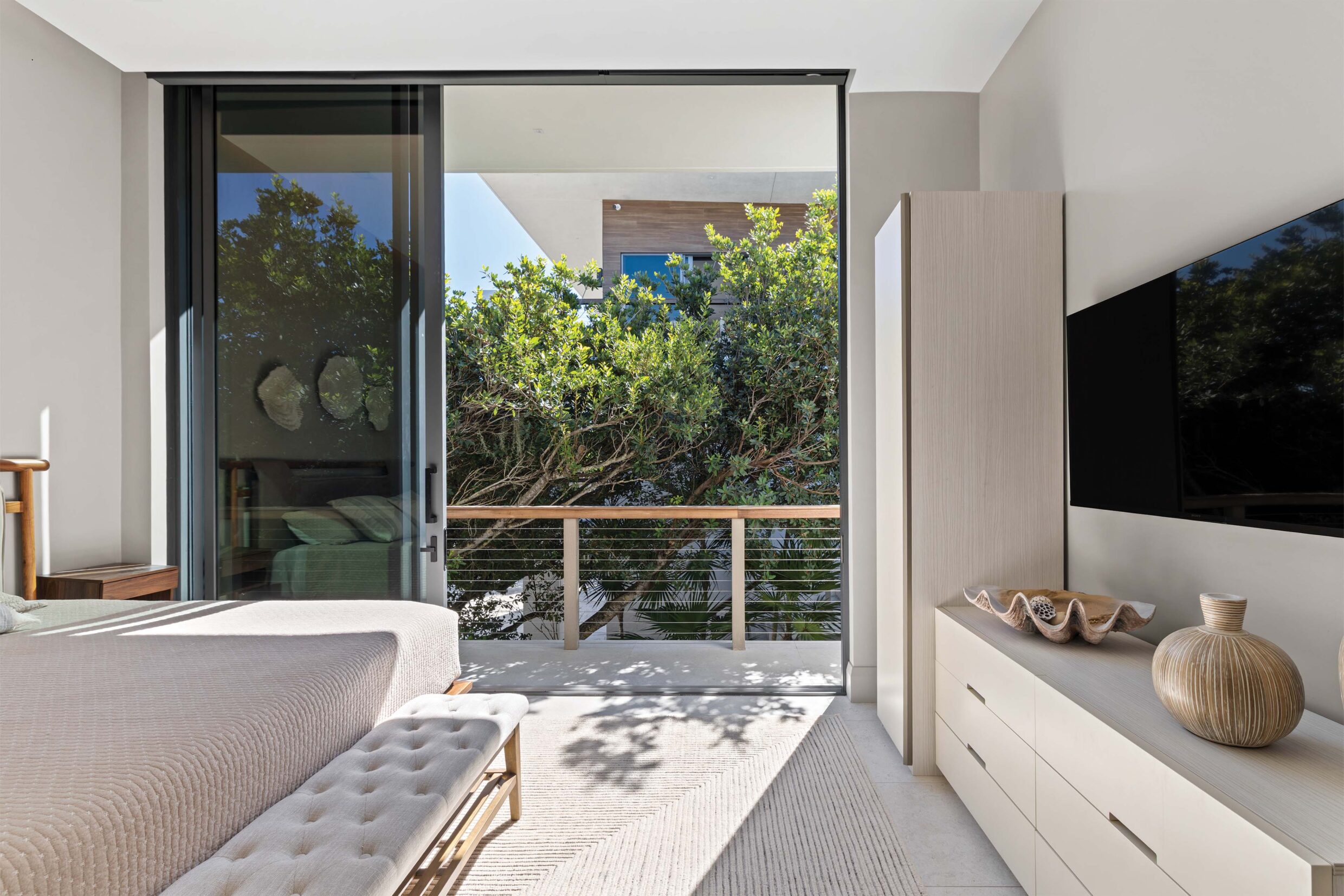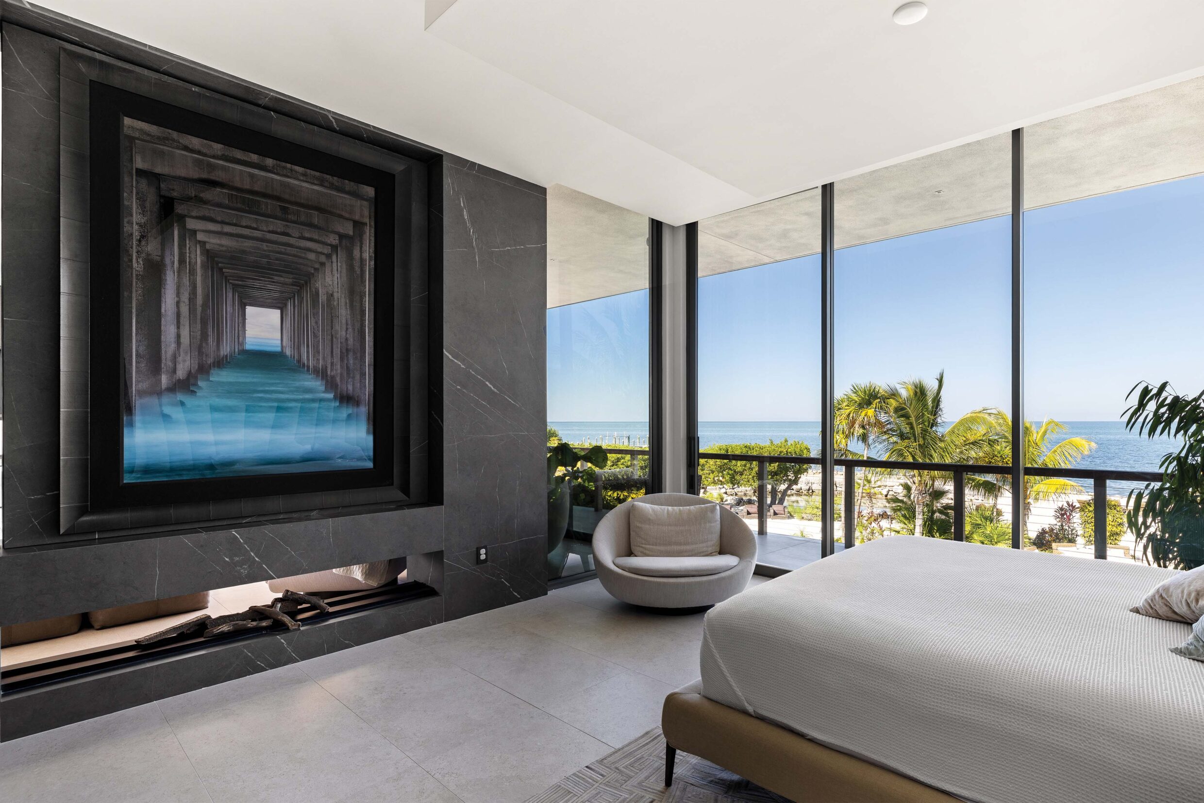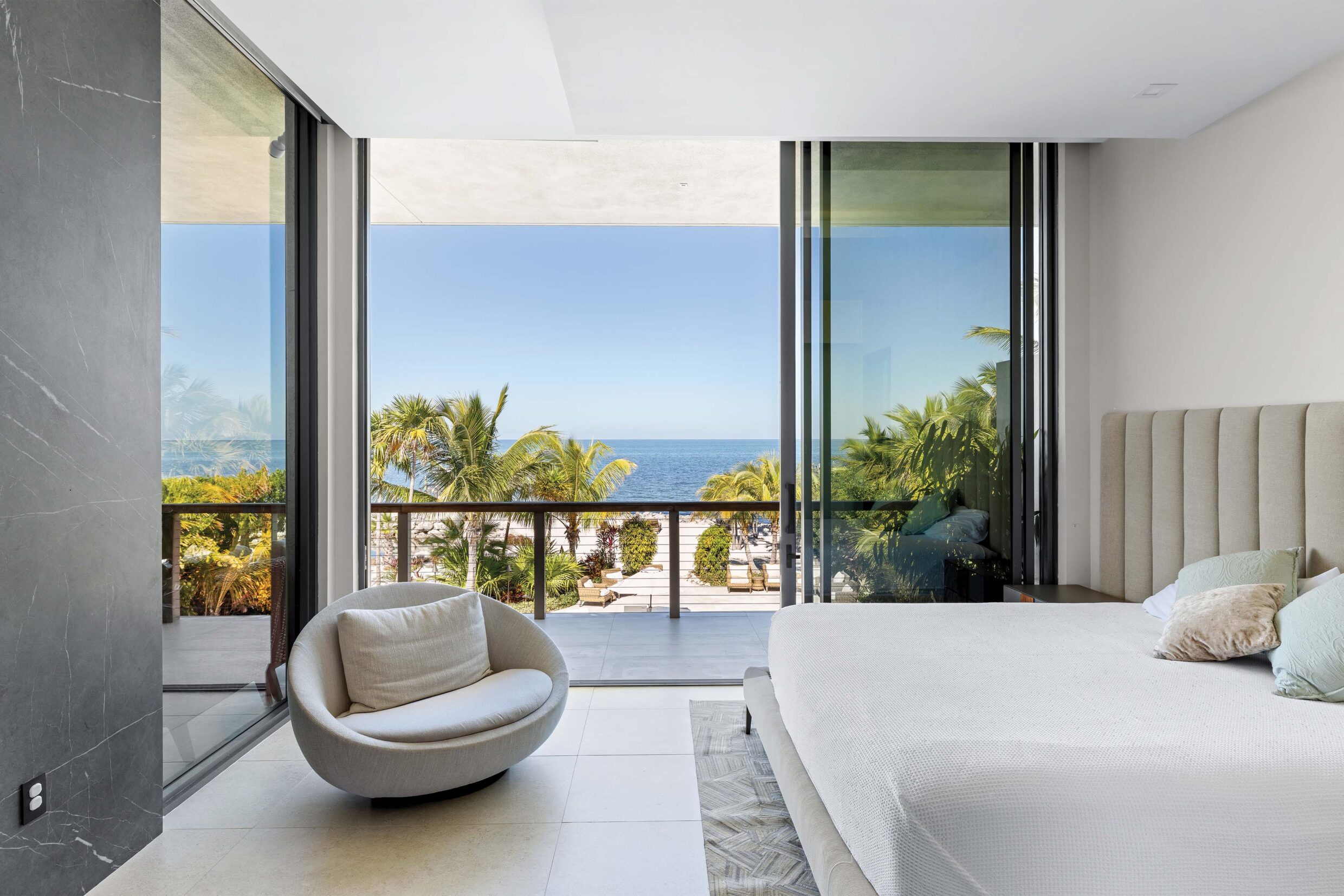 The primary suite occupies its own dedicated wing, offering a quiet sense of separation and direct access to a secluded terrace. Floor-to-ceiling glass frames uninterrupted Gulf views, and a discreet drop-down television retracts from the ceiling to provide entertainment without interrupting the panorama.