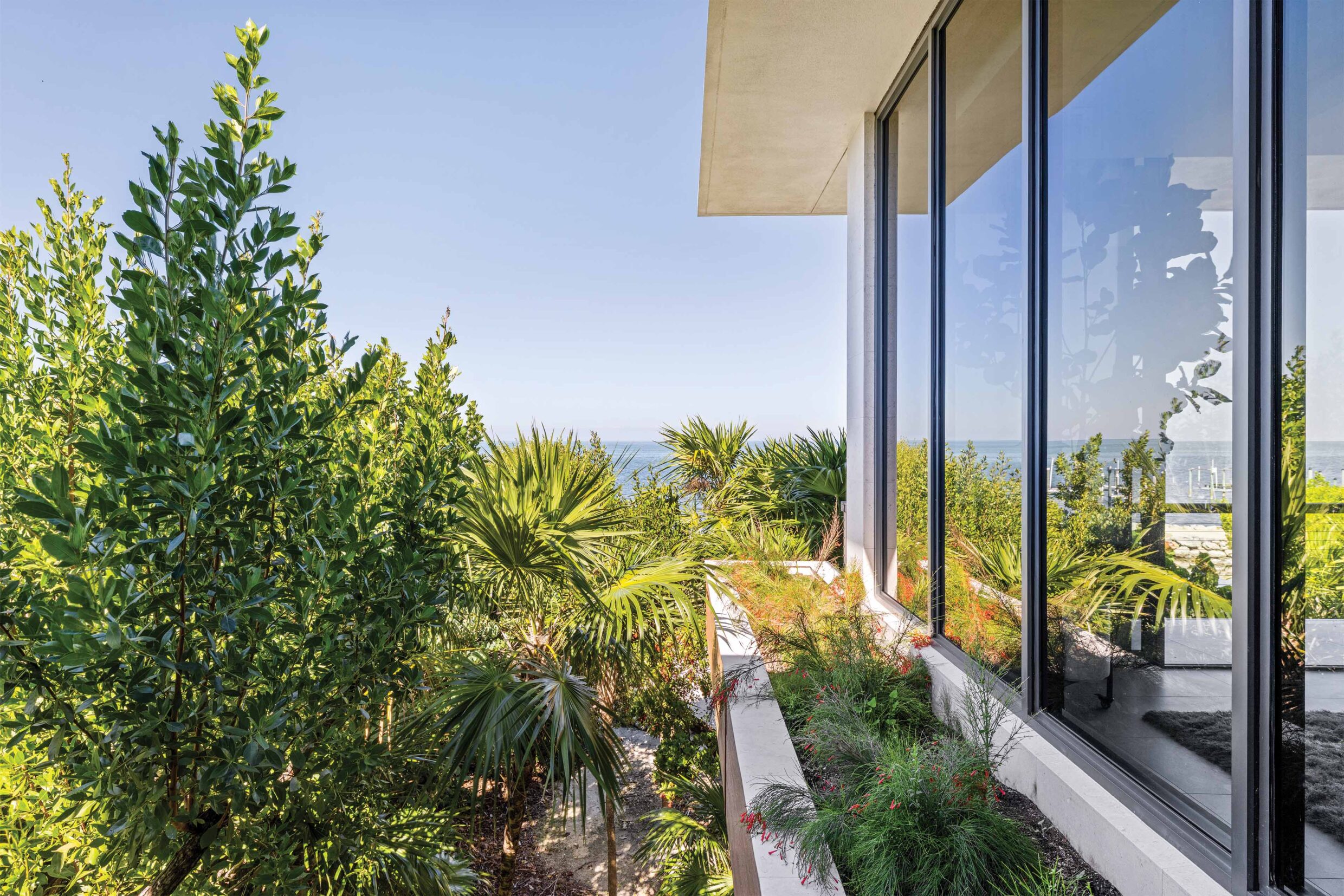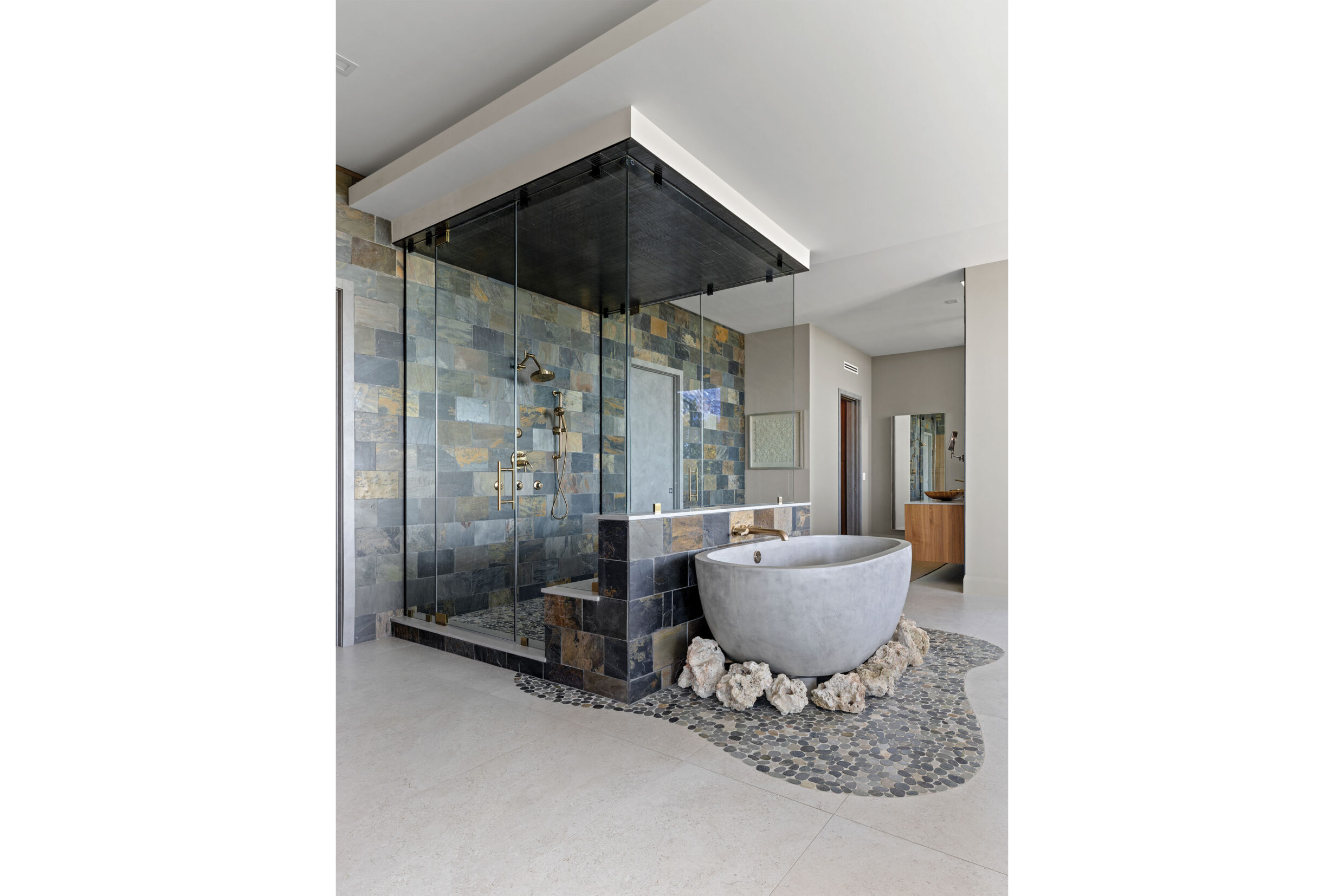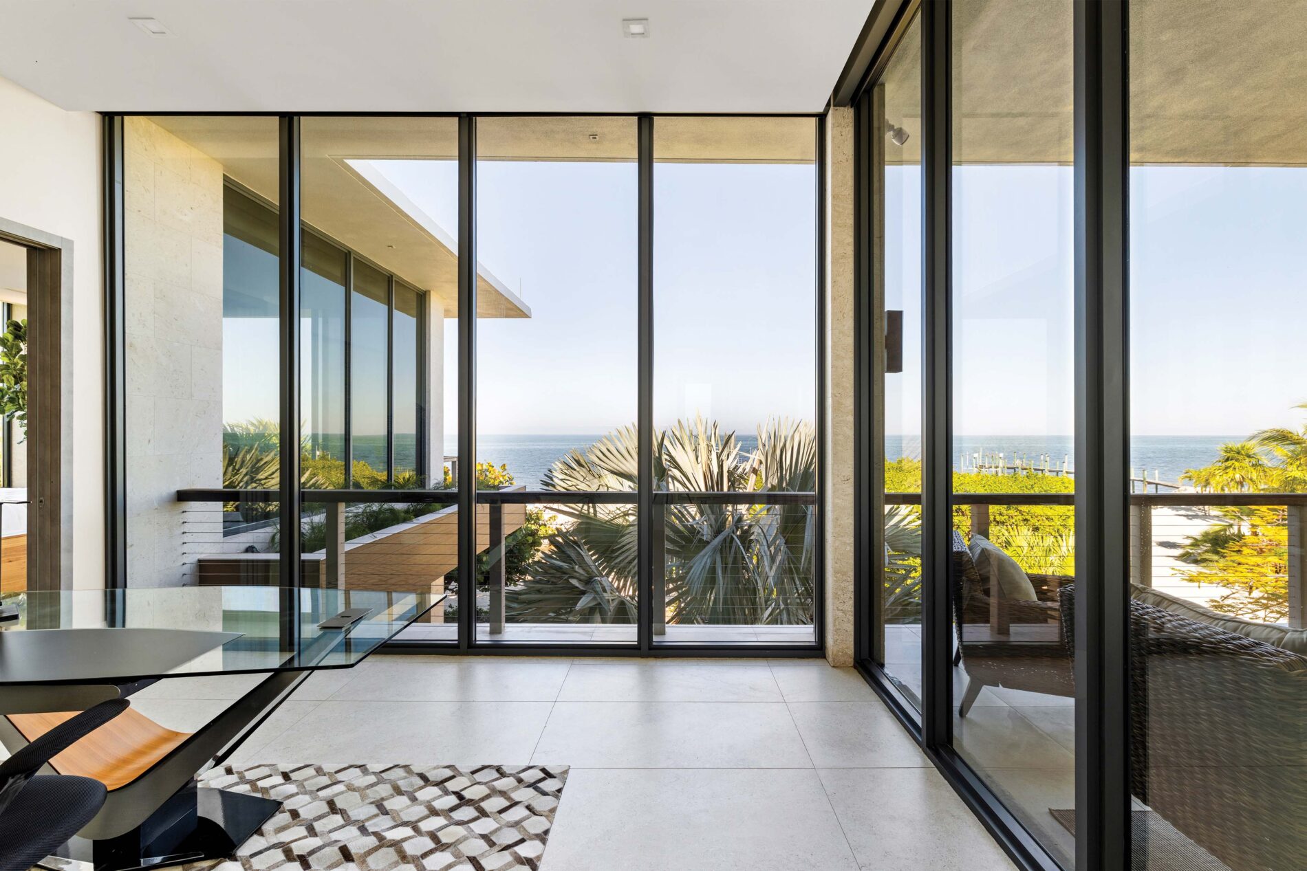 The architecture emphasizes clarity, durability, and immersion in water and light. Walls of impact glass capture views of the Gulf, the bay, and the property’s own tidal ponds, allowing natural light to animate the interiors throughout the day. Generous room proportions, ceiling heights of 10’ to 12’, and open circulation reinforce a sense of airiness and connection.