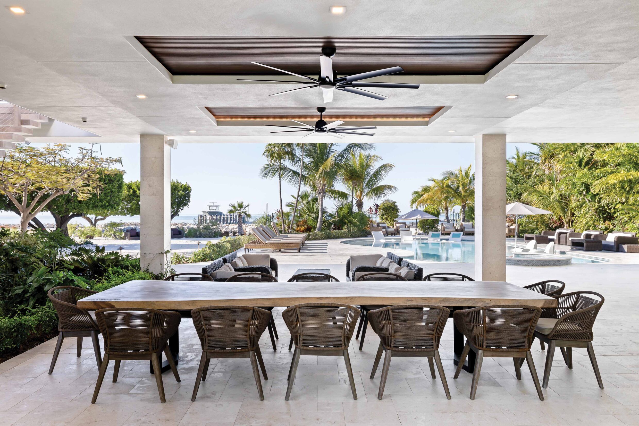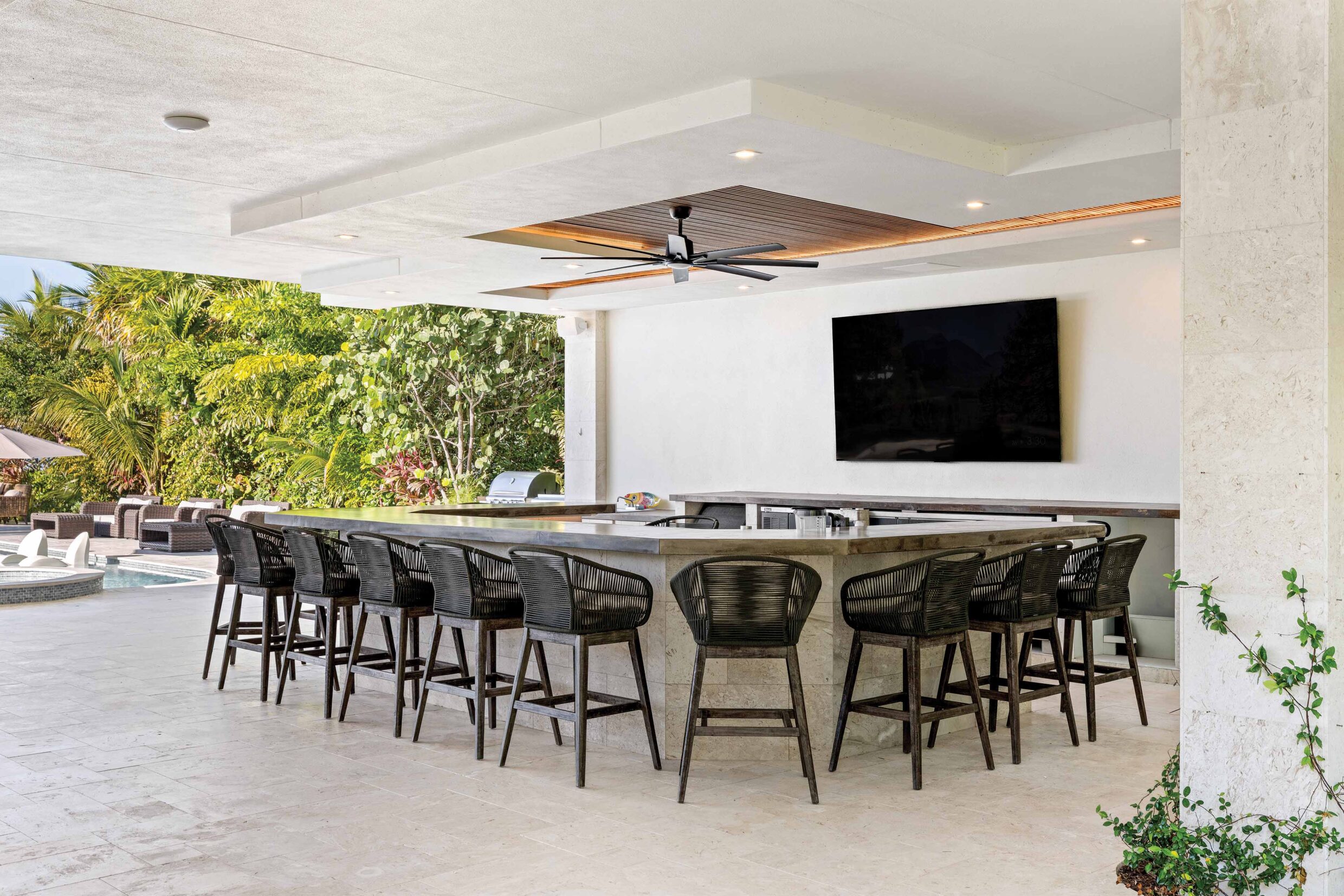 Outdoor living centers around a heated saline pool with a wide sun shelf and an attached spa, all oriented toward panoramic Gulf views. Terraces wrap the water’s edge, while a covered entertainment patio serves as the primary gathering hub with a fully equipped outdoor kitchen and generous dining and lounge areas. A dramatic waterfront bar with seating for fourteen overlooks the pool, gardens, and water beyond.