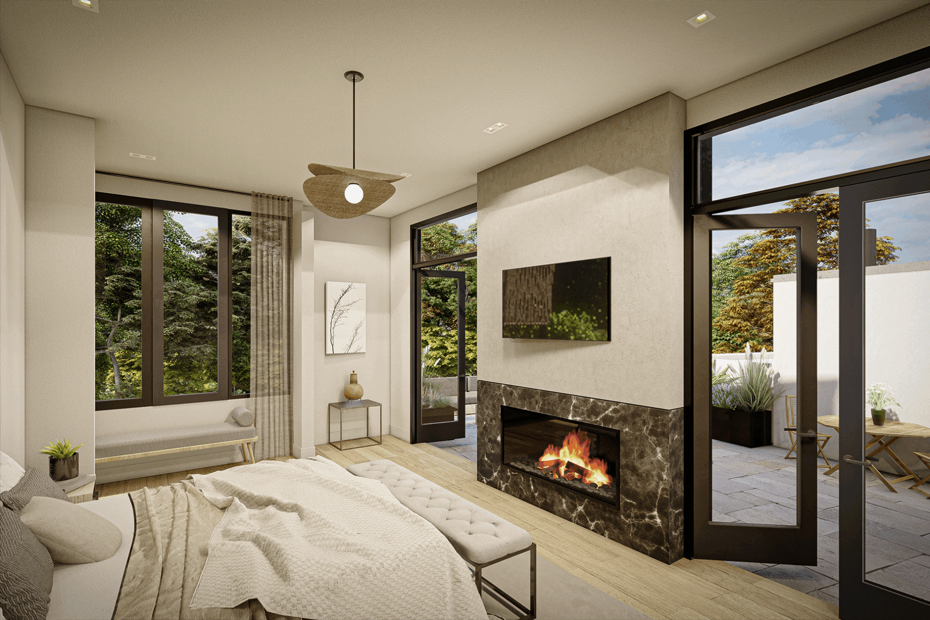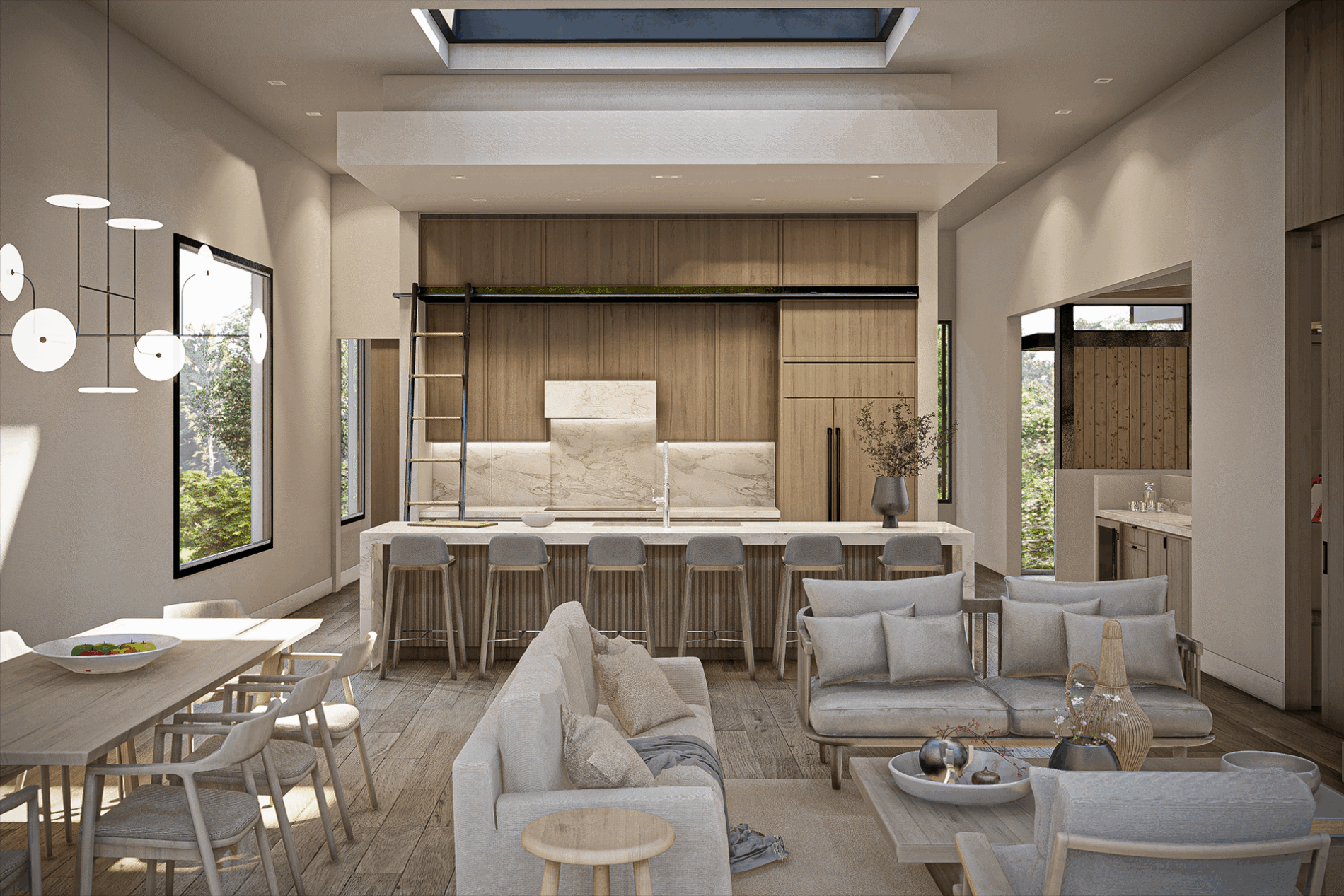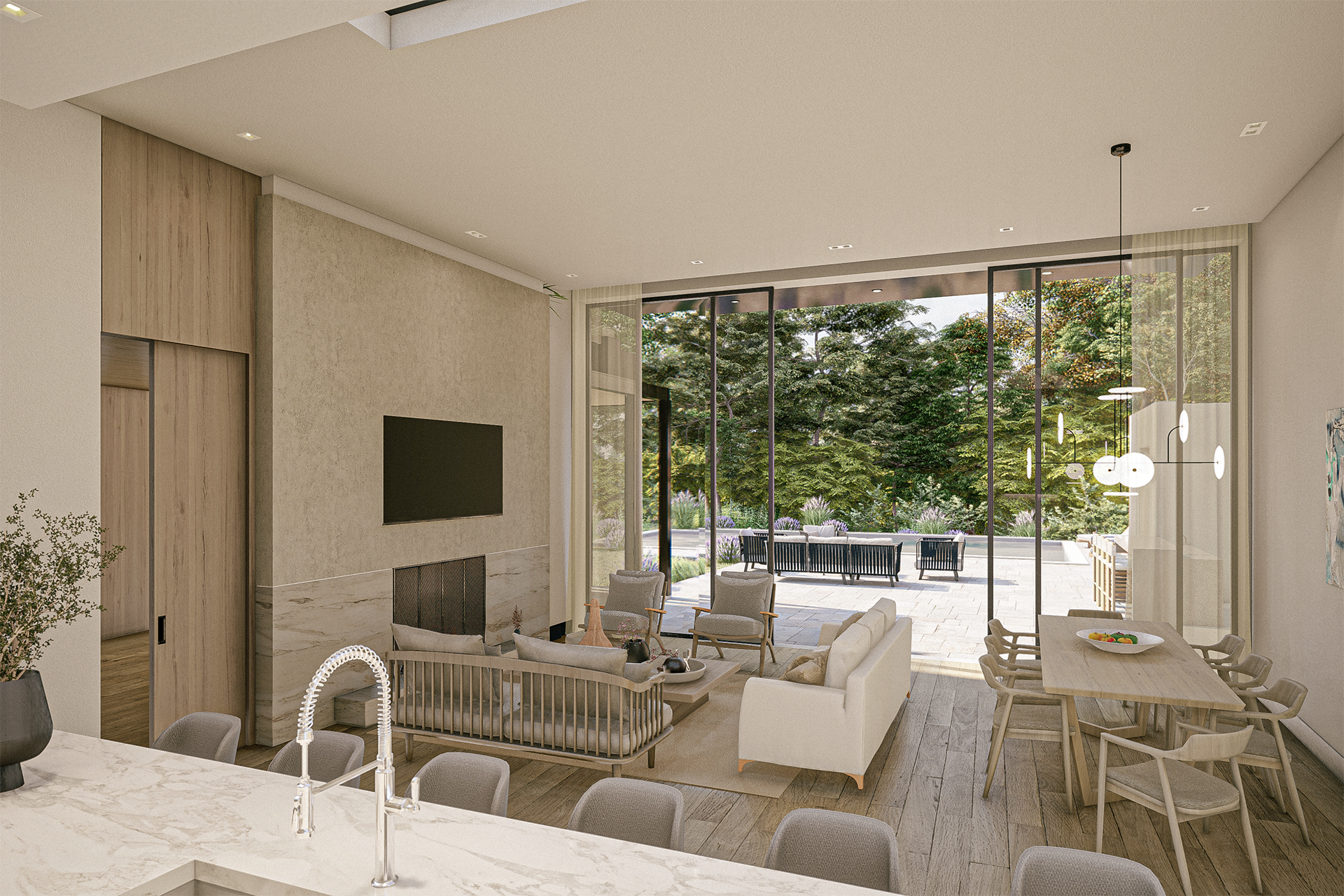 The interiors are shaped by clarity, proportion, and soft natural light. A hand-sculpted 3-story floating steel staircase topped by a skylight frame connects all 3-levels of luxurious living space. The main living area introduces an open and airy environment where a 25’ wide floor to ceiling glass wall draws the eye outward and opens fully to the rear terrace. This seamless flow between interior and exterior creates a central gathering space that is equally suited to quiet mornings or lively entertaining. A sculptural fireplace finished in venetian plaster anchors the room with a sense of calm elegance.