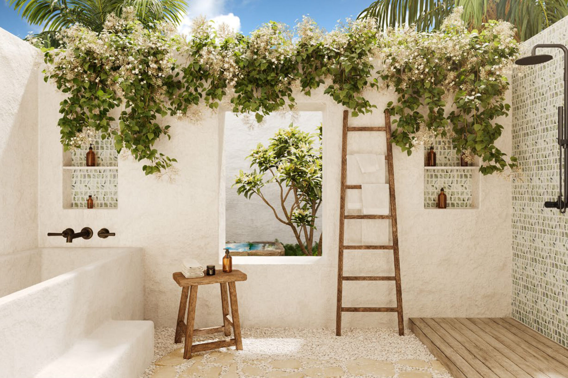 bathroomsAlong Princess Diana Beach at The Beach Club, Barbuda, a series of pavilion-style structures form Nobu Beach Inn Residence A, conceived as a private beachfront residence spanning 1 acre+/- with 100’+/- of direct ocean frontage. Positioned to frame open Caribbean Sea views, the architecture dissolves the boundary between interior and landscape.