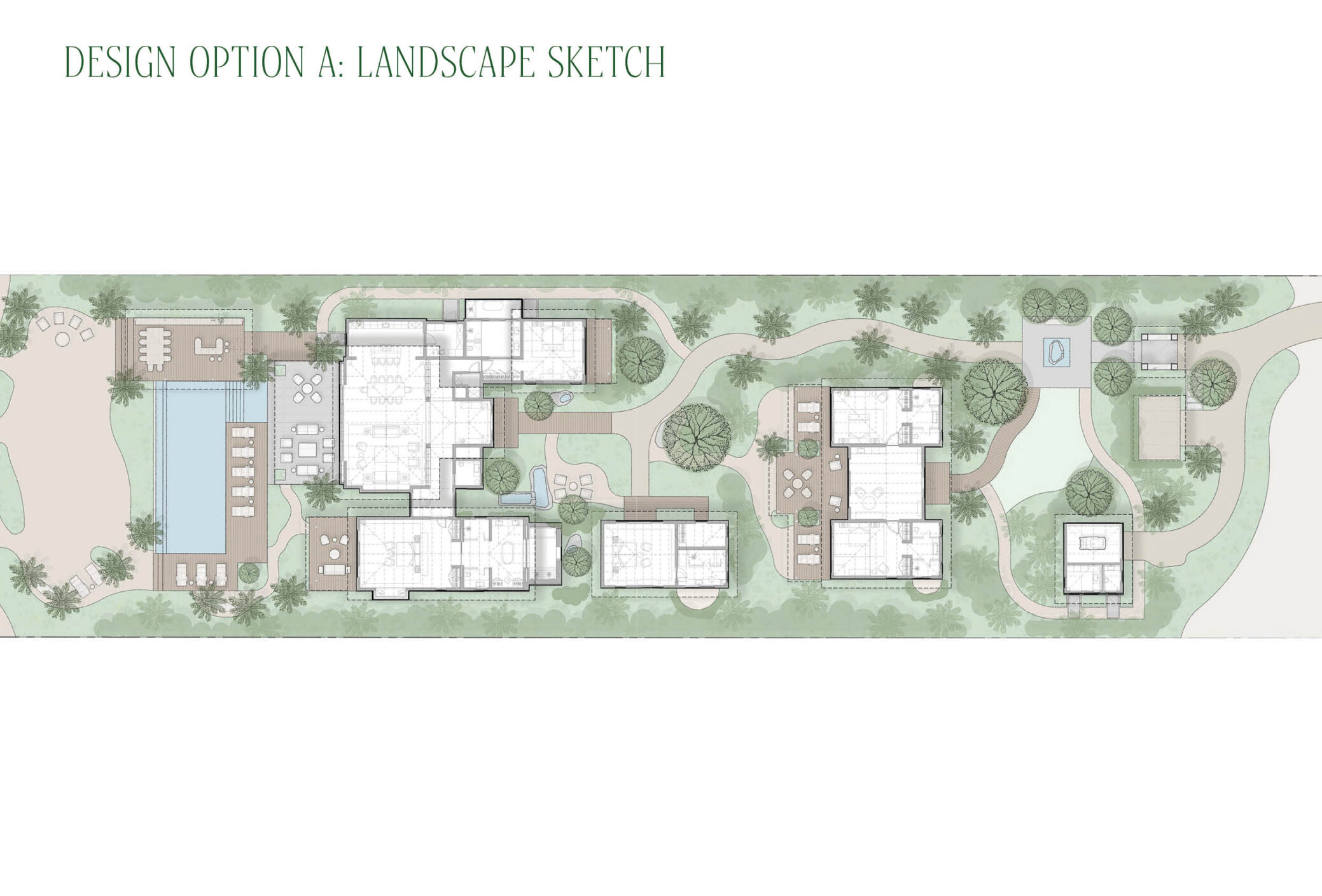 The residence comprises a total footprint of 11,311 SF +/-, including 5,997 SF +/- of interior living space. The layout includes 5 bedrooms, 4 full & 1 half bathrooms. Composed across several low-profile pavilions oriented around landscaped courtyards, shaded walkways, and outdoor terraces, the living and dining spaces open directly to the pool terrace, outdoor kitchen, and water. A restrained architectural language and natural material palette ground the residence within its coastal setting, while each structural element is positioned to preserve views, encourage natural light, and maintain privacy.